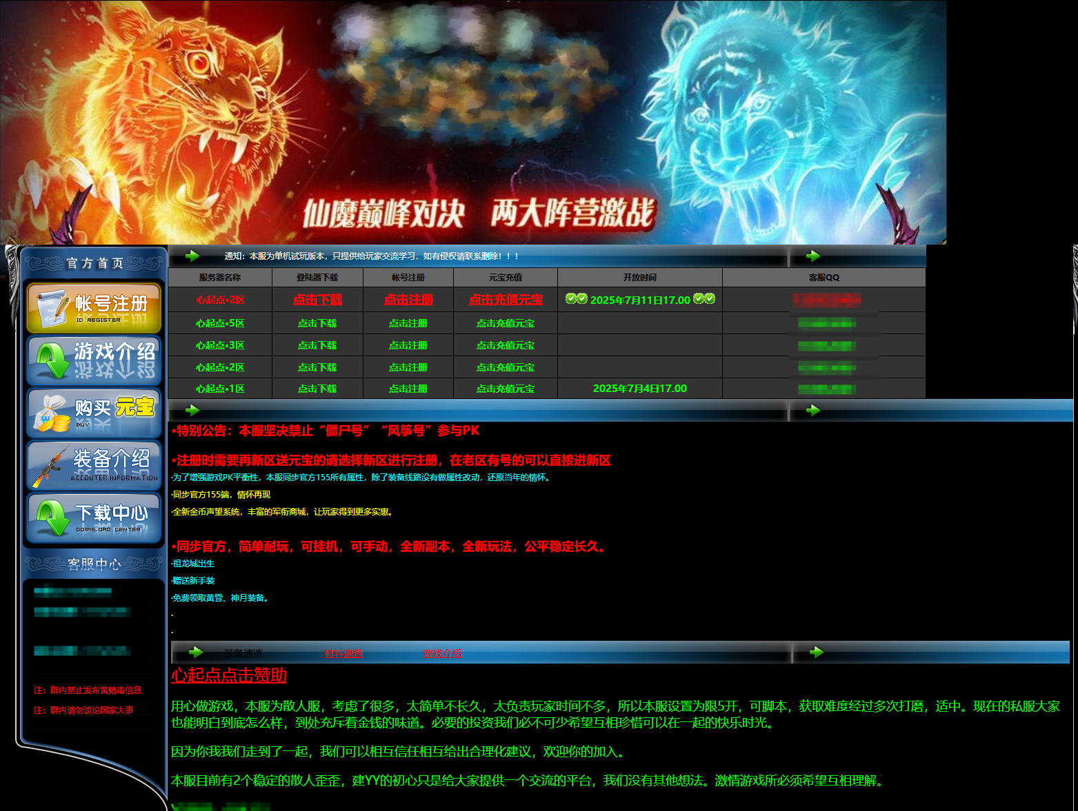 ·為了增強(qiáng)游戲PK平衡性,本服同步官方155所有屬性,除了裝備線路沒有做屬性改動(dòng),還原當(dāng)年的情懷。     ·同步官方155端,情懷再現(xiàn)     ·全新金幣聲望系統(tǒng),豐富的軍銜商城,讓玩家得到更多實(shí)惠。           ·同步官方,簡單耐玩,可掛機(jī),可手動(dòng),全新副本,全新玩法,公平穩(wěn)定長久。     ·祖龍城出生     ·贈(zèng)送新手裝     ·免費(fèi)領(lǐng)取黃昏、神月裝備。