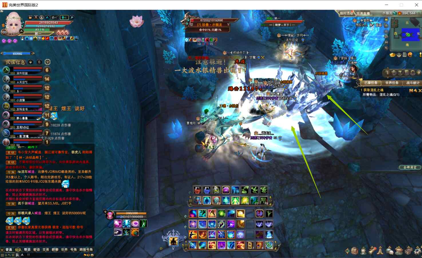 羽靈站在綠色箭頭地點,使用“五氣朝元”為隊友群體恢復(fù)血量,輔助職業(yè)如魅靈、妖精站位同羽靈。打手職業(yè)與妖獸站在藍色箭頭區(qū)域,不要靠近輔助區(qū)域,否則珍獸·水銀龍會因為仇恨問題而出現(xiàn)無敵狀態(tài),滿血回到原地。