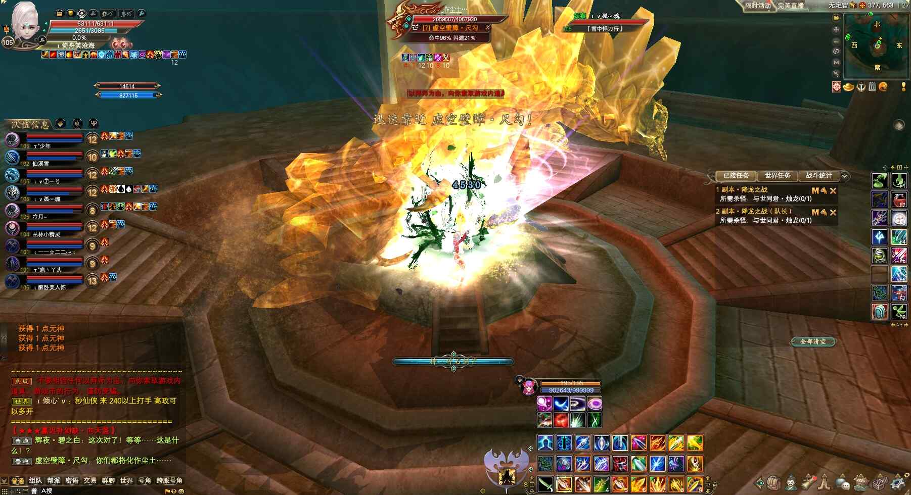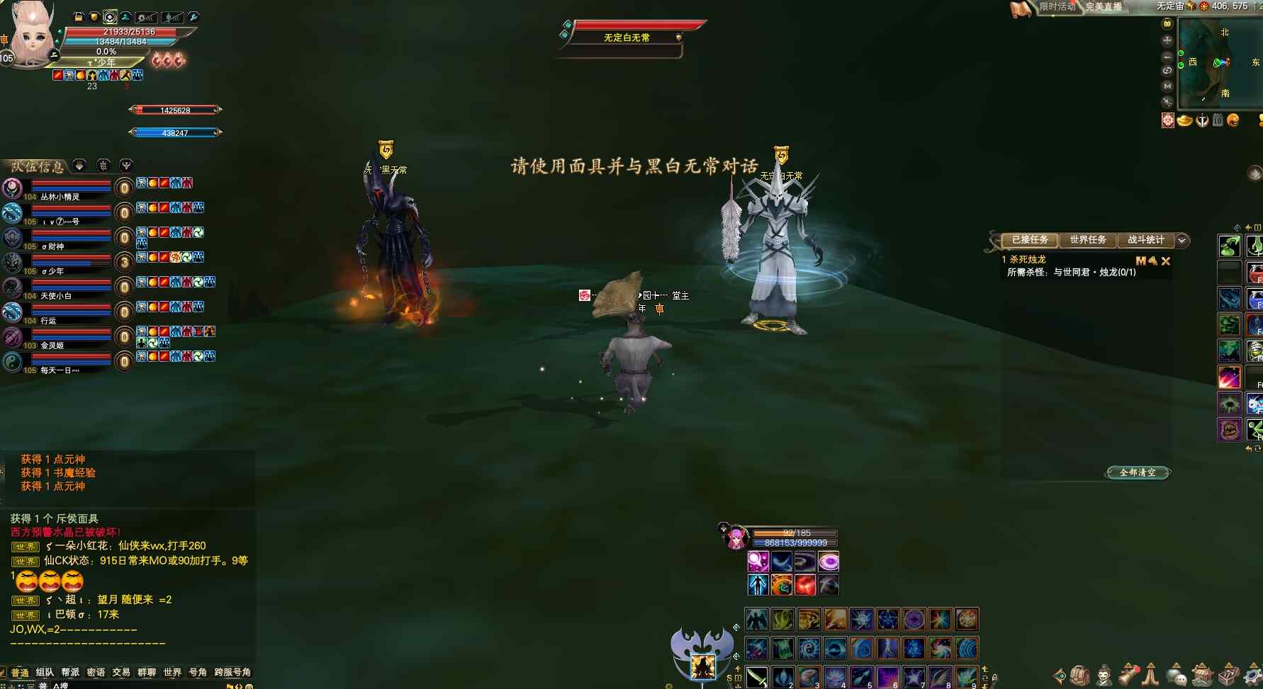 終極BOSS與世同君.燭龍在高級(jí)無定宙下方,直接跳下去,與世同君.燭龍會(huì)召喚幫手、施展時(shí)空騰挪之術(shù),與世同君.燭龍減傷BUFF羽靈丟技能神之封印,注意打掉小怪,戰(zhàn)斗結(jié)束旁邊NPC領(lǐng)取獎(jiǎng)勵(lì)。第一次擊殺與世同君.燭龍,可獲得永久稱號(hào)“屠龍者”。