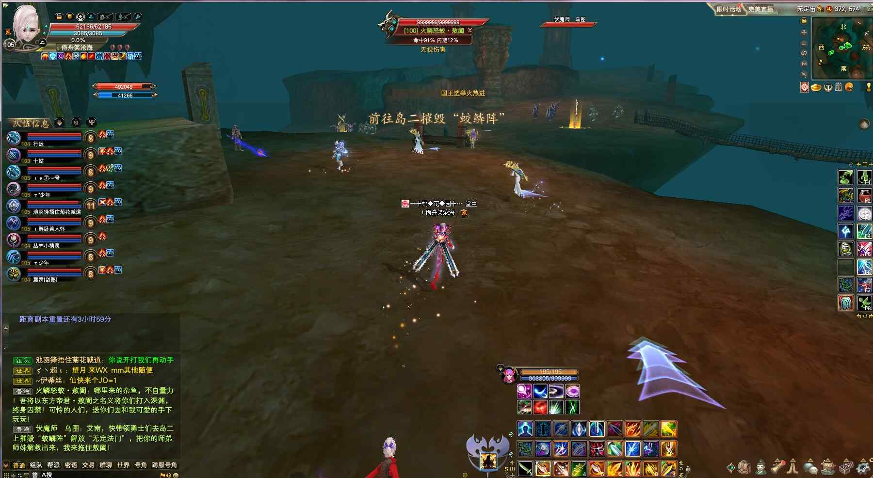 然后,隊(duì)伍島一集合分物理組、法系組,針對敖闔.龍?zhí)崾?ldquo;五行免疫”、敖闔.蛟提示“物免”,隊(duì)長統(tǒng)一指揮,需同時(shí)間擊殺敖闔.龍和敖闔.蛟,注意控制血量。誰“華光伏魔師弟子.錦熙”接取任務(wù),戰(zhàn)斗結(jié)束后找華光“伏魔師弟子.烏圖”交任務(wù),與世同君.燭龍就會(huì)出現(xiàn)在無定宙下方。第一次擊殺敖闔.龍和敖闔.蛟,可獲得永久稱號(hào)“混合雙打”。