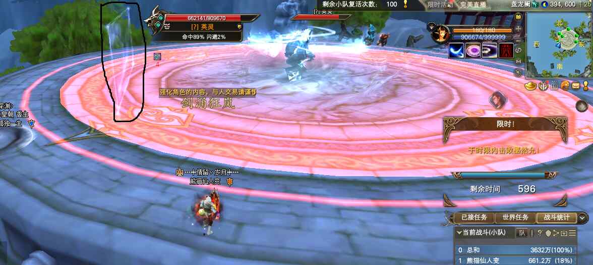 開打后,每隔20秒,屏幕提示劍涌狂嵐,BB以自己為中心,在腳下出個大紅圈,同時有個紅圈360°慢慢擴散,當填滿大紅圈時,