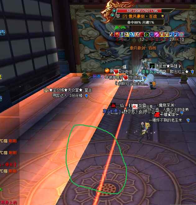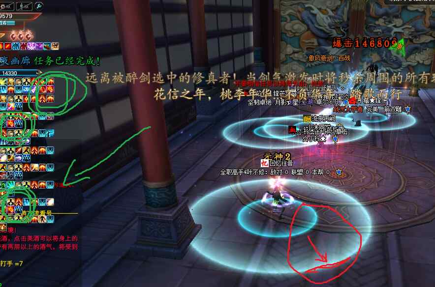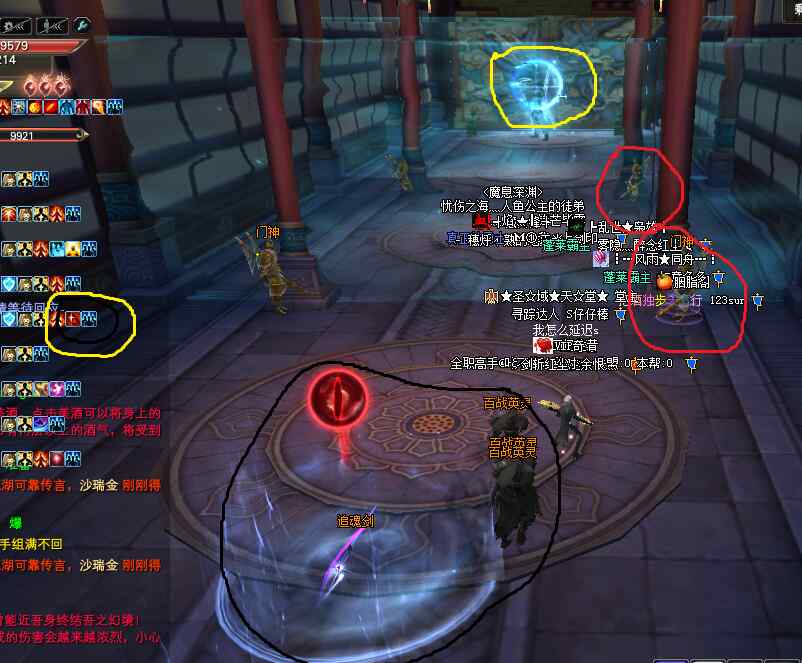 開怪后,怪每隔10秒左右會在一名玩家腳下召喚一個紅圈(嗜血池),如下圖綠圈標記所示