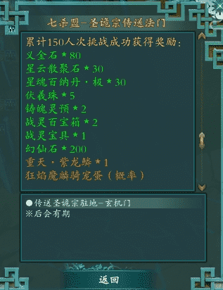 總結(jié),玩家參與百戰(zhàn)峽谷副本挑戰(zhàn)成功可獲得俠義值、義金,每周一結(jié)算獎(jiǎng)勵(lì)就是“義金石”,義金石在基地“幫派行商.傾玉”處可兌換“小黃手”、“小綠手”、星魂百納丹.極、符文包(8級(jí))、戰(zhàn)靈寶箱.S、神語(yǔ)級(jí)仙童精粹等?;?關(guān)挑戰(zhàn)成功獎(jiǎng)勵(lì)如下,挑戰(zhàn)成功一次可獲得永久稱號(hào)“戰(zhàn)七殺.機(jī)械公敵”,生命+20。