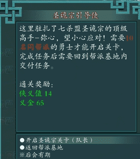 百戰(zhàn)峽谷副本源于“七殺盟”勢(shì)力復(fù)燃,幫派基地10人副本,共七關(guān),其中周四開(kāi)啟第4關(guān)挑戰(zhàn)BOSS是圣詭宗.彌心、副本叫“玄機(jī)門(mén)”,下面主要介紹圣詭宗.彌心、建議隊(duì)伍配置、必備物品、通關(guān)流程等。參與條件:①角色等級(jí)達(dá)到一轉(zhuǎn)100級(jí),境界玄天一重以上;②10人隊(duì)伍且必須是同一個(gè)幫派的成員;③基地前三關(guān)已通關(guān),提示“完成”。