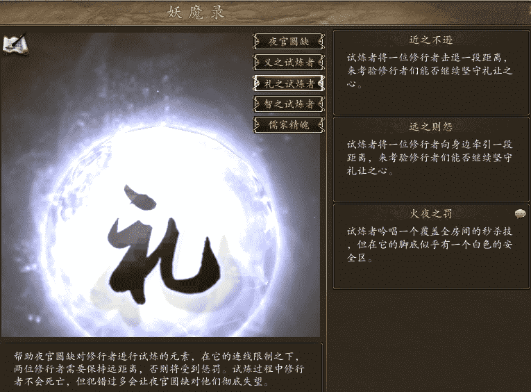 2.禮之試煉---隊(duì)長(zhǎng)安排兩個(gè)遠(yuǎn)程職業(yè)、或一個(gè)近戰(zhàn)職業(yè)和一個(gè)遠(yuǎn)程職業(yè),從NPC進(jìn)小房間,站字后連線保持遠(yuǎn)離一起攻擊出現(xiàn)的“禮”球、90秒限時(shí)擊殺,主房間注意大家一起清小怪“靈袖”、清怪不及時(shí)提示“懶惰”副本將重置,戰(zhàn)斗結(jié)束密語(yǔ)小房間某個(gè)玩家“某個(gè)方向鏡像是假的!”、請(qǐng)及時(shí)隊(duì)伍打字報(bào)方向或YY語(yǔ)音告訴大家,主房間集火打掉那個(gè)方向夜官圓的鏡像,BOSS從空中下來(lái)、并喊話“你們果然足夠團(tuán)結(jié)!繼續(xù)接下來(lái)考驗(yàn)吧!”,繼續(xù)戰(zhàn)斗,四種機(jī)制四向斬、天地滅群攻、定魂引、義禮智考驗(yàn)將重復(fù)按順序再次出現(xiàn),直到出現(xiàn)智之試煉。