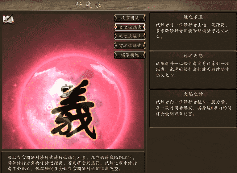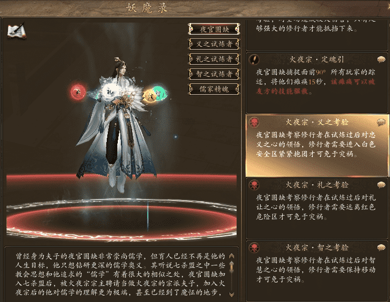 火夜宗.夜官圓缺---曾經(jīng)身為夫子的夜官圓缺非常崇尚儒學(xué),但育人已經(jīng)不再是他的人生目標(biāo),他只想鉆研更深的儒學(xué)奧義。其聽(tīng)說(shuō)七殺盟之中一些教會(huì)思想和他追求的“儒學(xué)”有著很大的相似之處,夜官圓缺加入七殺盟后,被火夜宗宗主聘請(qǐng)當(dāng)做火夜宗的宗派夫子,加入火夜宗后的他對(duì)儒學(xué)的理解更為極端,甚至已經(jīng)到了魔怔的地步,對(duì)每個(gè)接受他考驗(yàn)的人要求極為苛刻,如果達(dá)不到他的要求,會(huì)以死作為對(duì)考驗(yàn)者的懲罰。