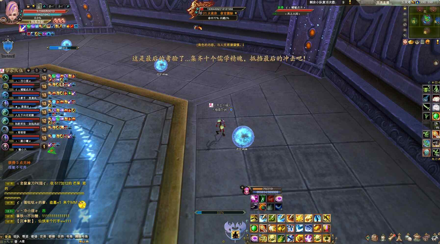 3.智之試煉---隊(duì)長(zhǎng)安排兩個(gè)職業(yè)其中一個(gè)必須是高攻(因?yàn)榱硪粋€(gè)玩家保持移動(dòng)不可以攻擊“智”球)、或移動(dòng)職業(yè)是月仙最佳,從NPC進(jìn)小房間,站字后連線需一個(gè)玩家保持移動(dòng)(建議劍靈上劍印破斧后再保持移動(dòng))另一個(gè)攻擊出現(xiàn)的“智”球、90秒限時(shí)擊殺,主房間注意大家一起清小怪“靈袖”、清怪不及時(shí)提示“懶惰”副本將重置,戰(zhàn)斗結(jié)束密語(yǔ)小房間某個(gè)玩家“某個(gè)方向鏡像是假的!”、請(qǐng)及時(shí)隊(duì)伍打字報(bào)方向或YY語(yǔ)音告訴大家,主房間集火打掉那個(gè)方向夜官圓的鏡像,BOSS從空中下來(lái)、并喊話“你們果然足夠團(tuán)結(jié)!繼續(xù)接下來(lái)考驗(yàn)吧!”,繼續(xù)戰(zhàn)斗,四種機(jī)制四向斬、天地滅群攻、定魂引、義禮智考驗(yàn)將重復(fù)按順序再次出現(xiàn),直到BOSS喊話最后考驗(yàn)挖球“儒學(xué)精魄”。