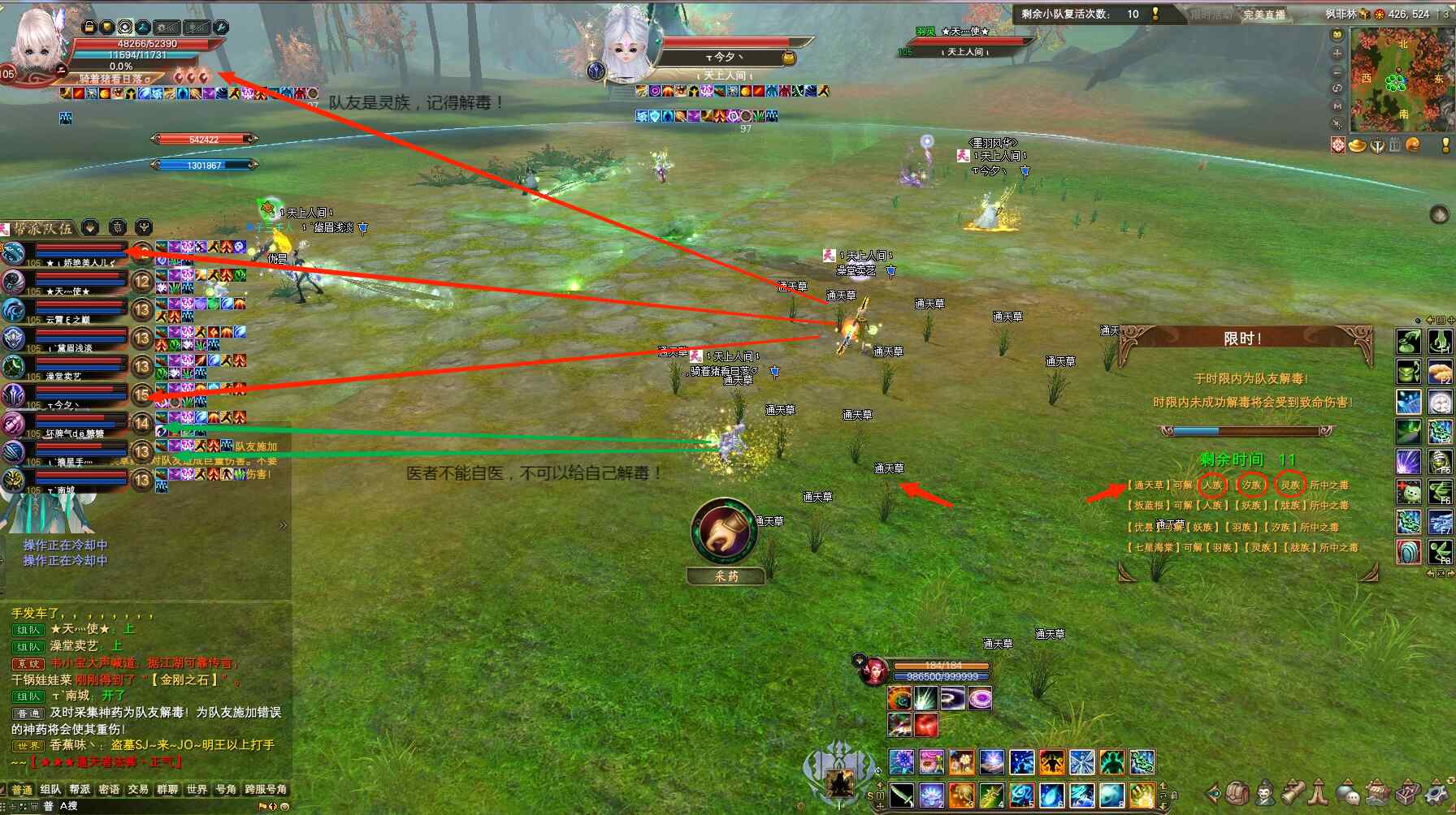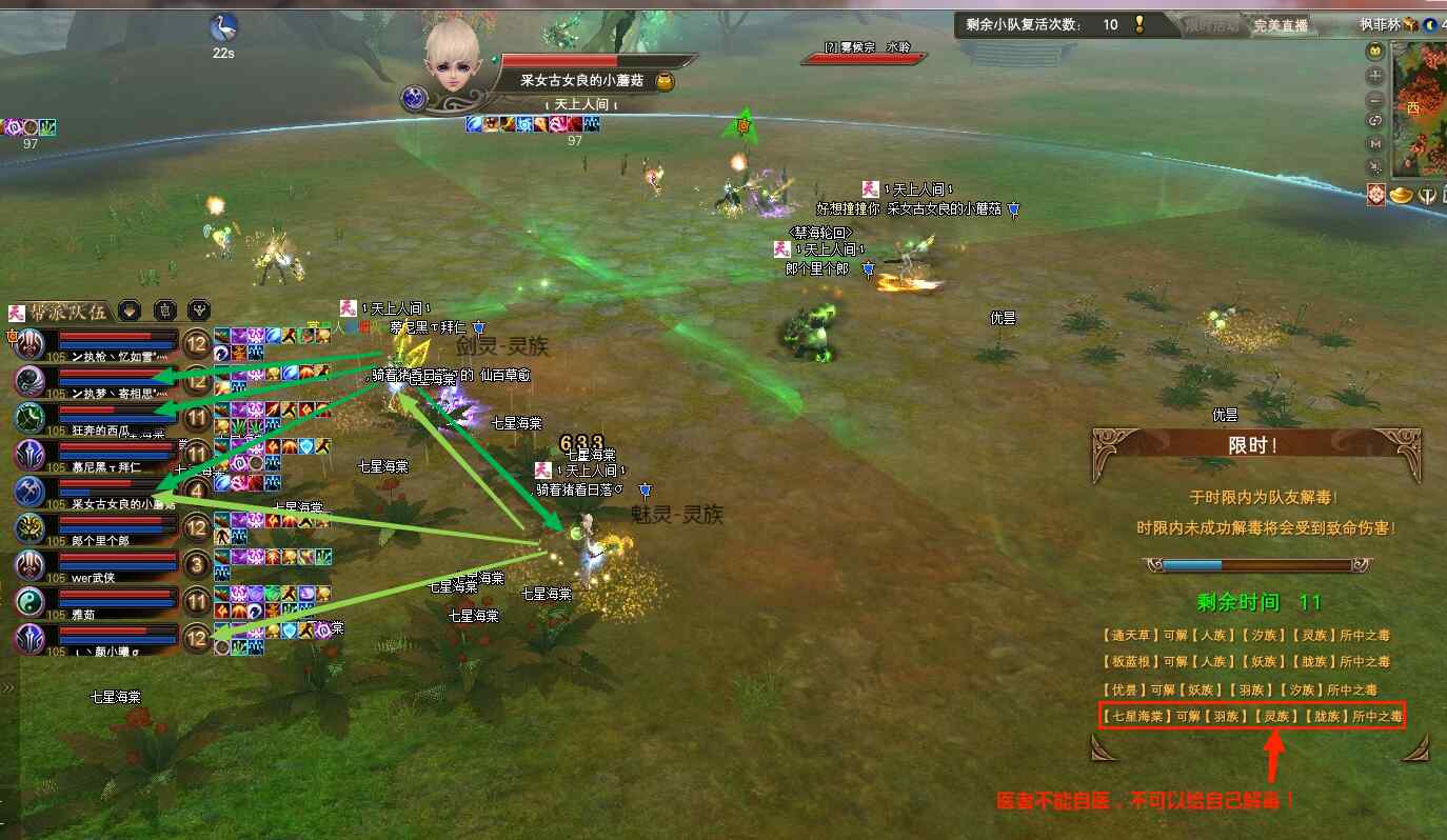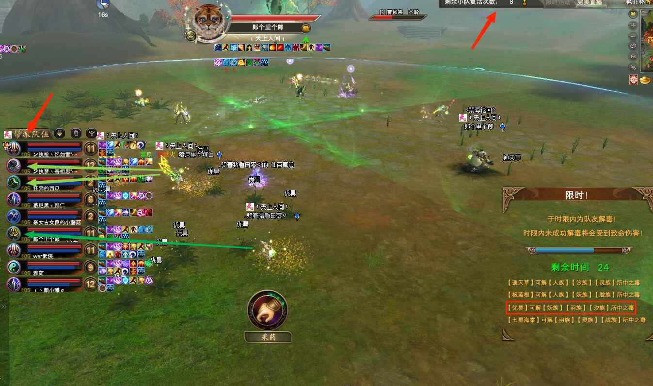 2.草藥解毒機(jī)制:共計(jì)四次限時(shí)草藥解毒機(jī)制,草藥分別是通天草、板藍(lán)根、優(yōu)曇、七星海棠,四種草藥同時(shí)隨機(jī)區(qū)域出現(xiàn),需兩種正確草藥才可以解除隊(duì)友中毒狀態(tài),其中羽靈---虔誠、魅靈---自然屏障、刺客---如來天心咒、武俠---金剛、妖獸---不滅戰(zhàn)魂、法師---銀石太虛逆流決等可以免去一次不用解毒但需要技能冷卻、記得倒計(jì)時(shí)5秒提前開免死技能。下圖解毒按草藥舉例: