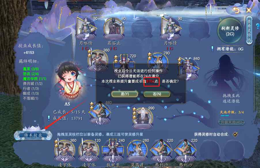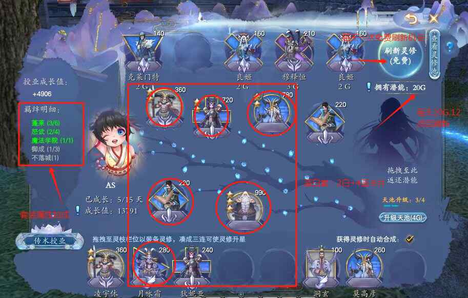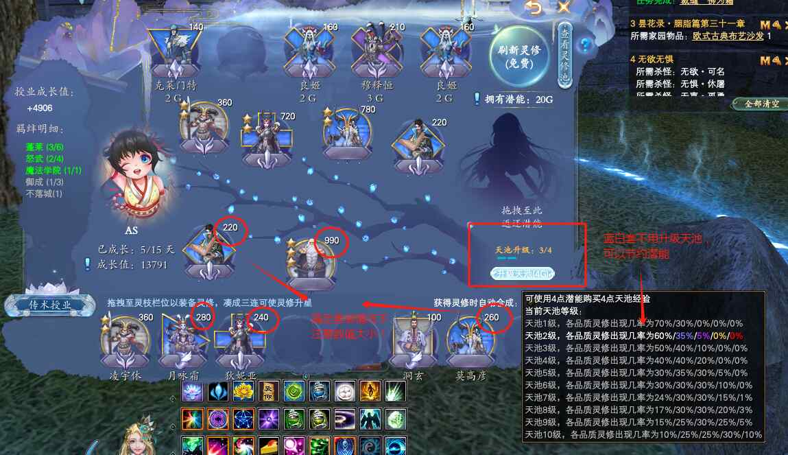 開(kāi)啟新的一天,我們可以看到小仙童擁有20G的潛能,以及一次免費(fèi)刷新靈修的機(jī)會(huì)。后續(xù)每次刷新消耗2G潛能,購(gòu)買靈修也需要花費(fèi)相對(duì)應(yīng)的潛能,也可以用潛能來(lái)購(gòu)買天池經(jīng)驗(yàn),用于升級(jí)天池!天池等級(jí)越高,刷到高等級(jí)卡片的機(jī)率也越高!那是不是天池等級(jí)越高越好呢?每天就20G,怎么才夠花呢?