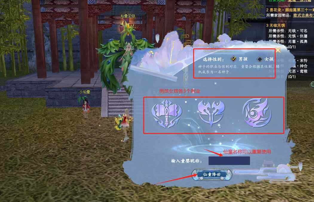 點(diǎn)擊仙童圣母對(duì)話以后,會(huì)給你三男三女6個(gè)職業(yè)的仙童選擇,可以任選其中一個(gè)性別職業(yè)降生,也可以選擇你最缺神語(yǔ)級(jí)的仙童職業(yè)。仙童名字可以重復(fù)使用,大家隨意就好!輸入名字點(diǎn)擊仙童降生,游戲界面右下角的仙童系統(tǒng)中,就會(huì)出現(xiàn)一個(gè)剛出生的仙童寶寶哦!