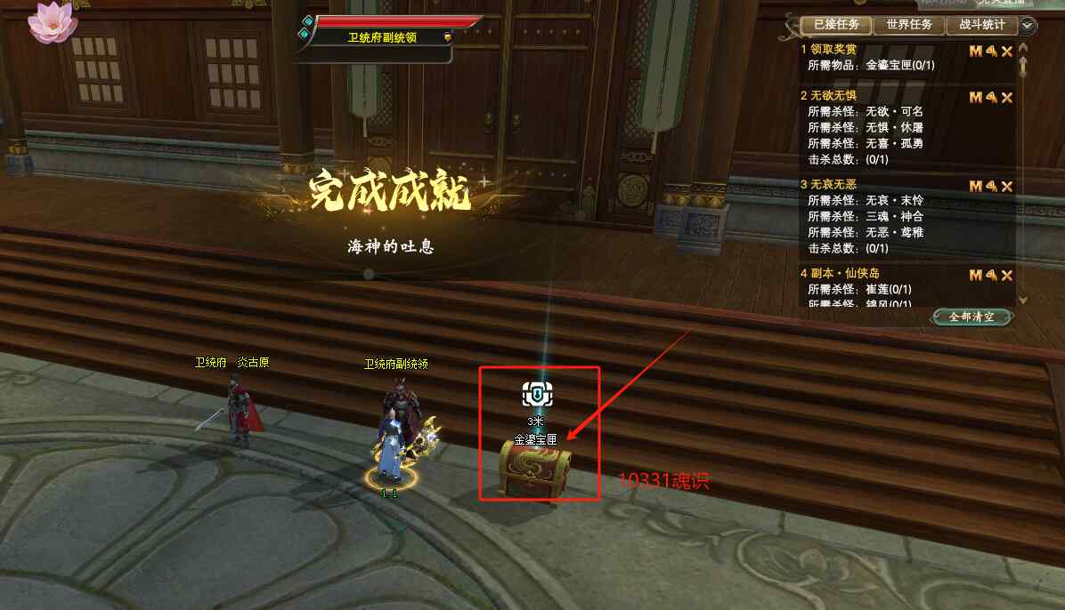 傳送返回衛(wèi)統(tǒng)府,(132.423)副統(tǒng)領(lǐng)處交任務(wù)!完成成就:海神的吐息,獎勵五個天行宮饋印。獎勵金鎏寶匣:10331魂識,20個天行宮饋印。颶風(fēng)之患任務(wù),全部完成!小伙伴們,快點一起來挖寶箱了!東路任務(wù)畢業(yè),指日可待!~~