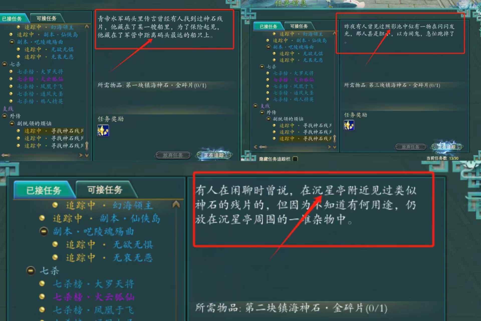 傳送到衛(wèi)統(tǒng)府(132.423)副統(tǒng)領(lǐng)接任務(wù)哦 !對話完成后,接到尋找神石殘片任務(wù)。沒有追蹤坐標(biāo),也沒有黃圈追蹤提示。那么我們怎么知道這三個神石殘片在哪里呢?! 打開我們Q任務(wù)欄,已接任務(wù)的詳情介紹里面,告知了三個殘片分別位于青帝水軍最遠的一艘船(108.385),沉星亭(76.335),照影池(123.329)水下哦。