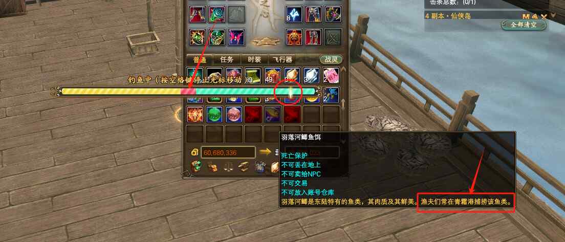 羽落河鯽:原地打開包裹,使用包里的羽落河鯽魚餌,等白色光標(biāo)移動到紅色區(qū)域時,按下空格鍵。就會得到羽落河鯽。如果按到了黃色和藍色區(qū)域,會釣到小蝦米,不要著急,會返還給你魚餌,繼續(xù)釣就可以了。多練習(xí)幾次就能輕松點到紅色區(qū)域了!