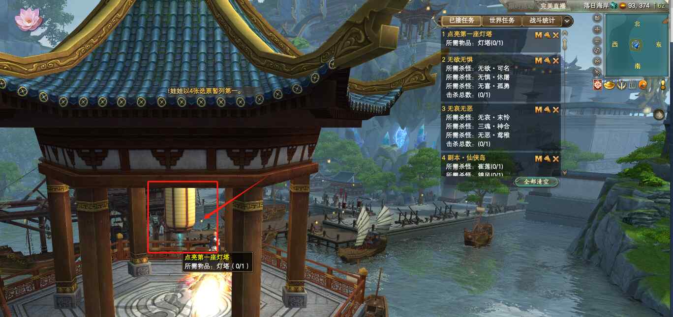 點亮第一座燈塔,飛起來到塔頂(93.374.高度62)挖中間燈籠點亮。然后往北飛,去第二座燈塔(76.432高度62),第三座燈塔(72.457.高度62),第四座燈塔(81.470.高度62)。
