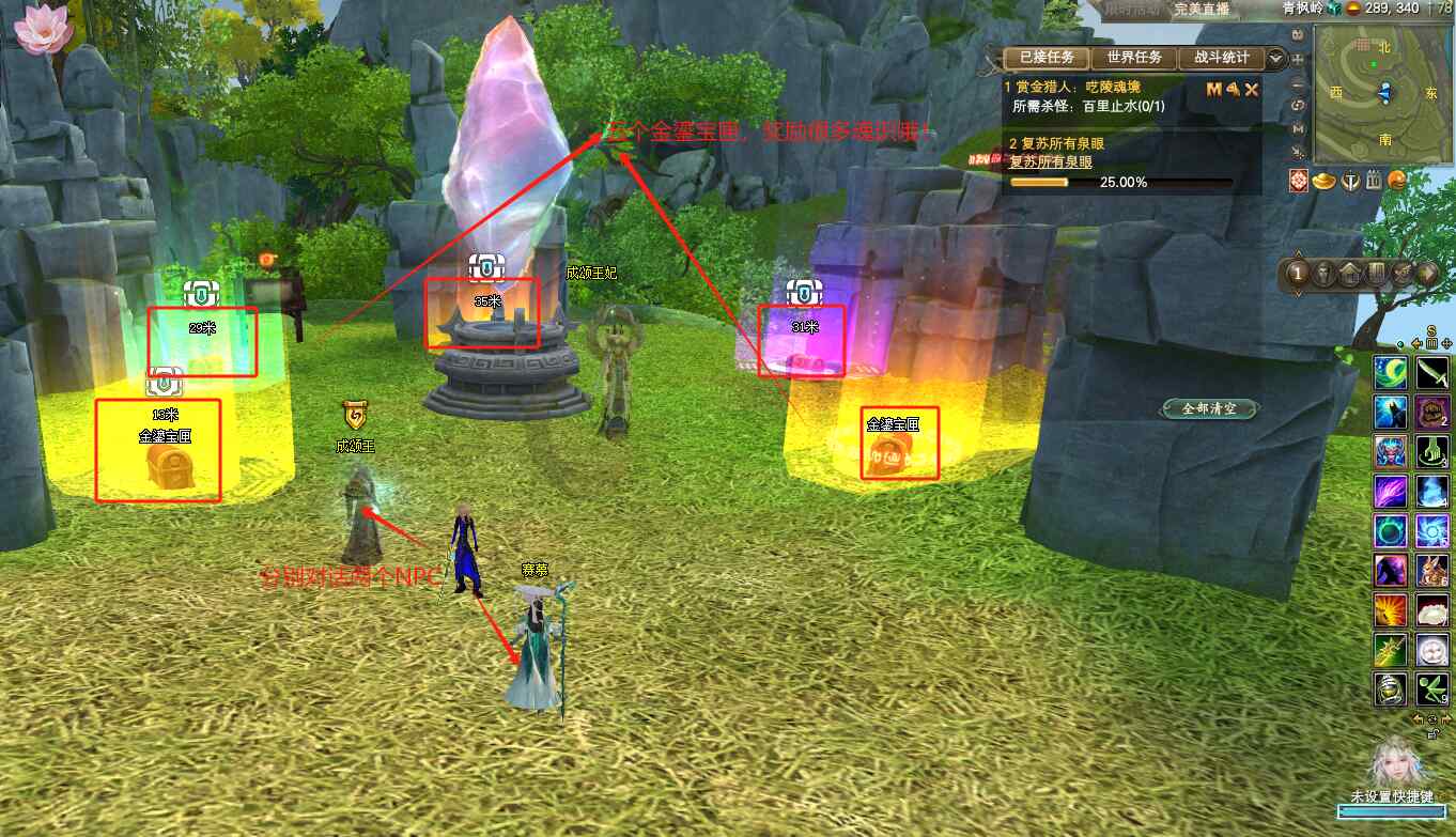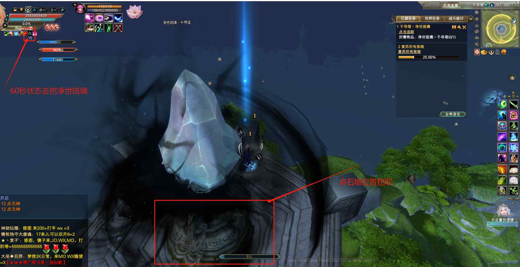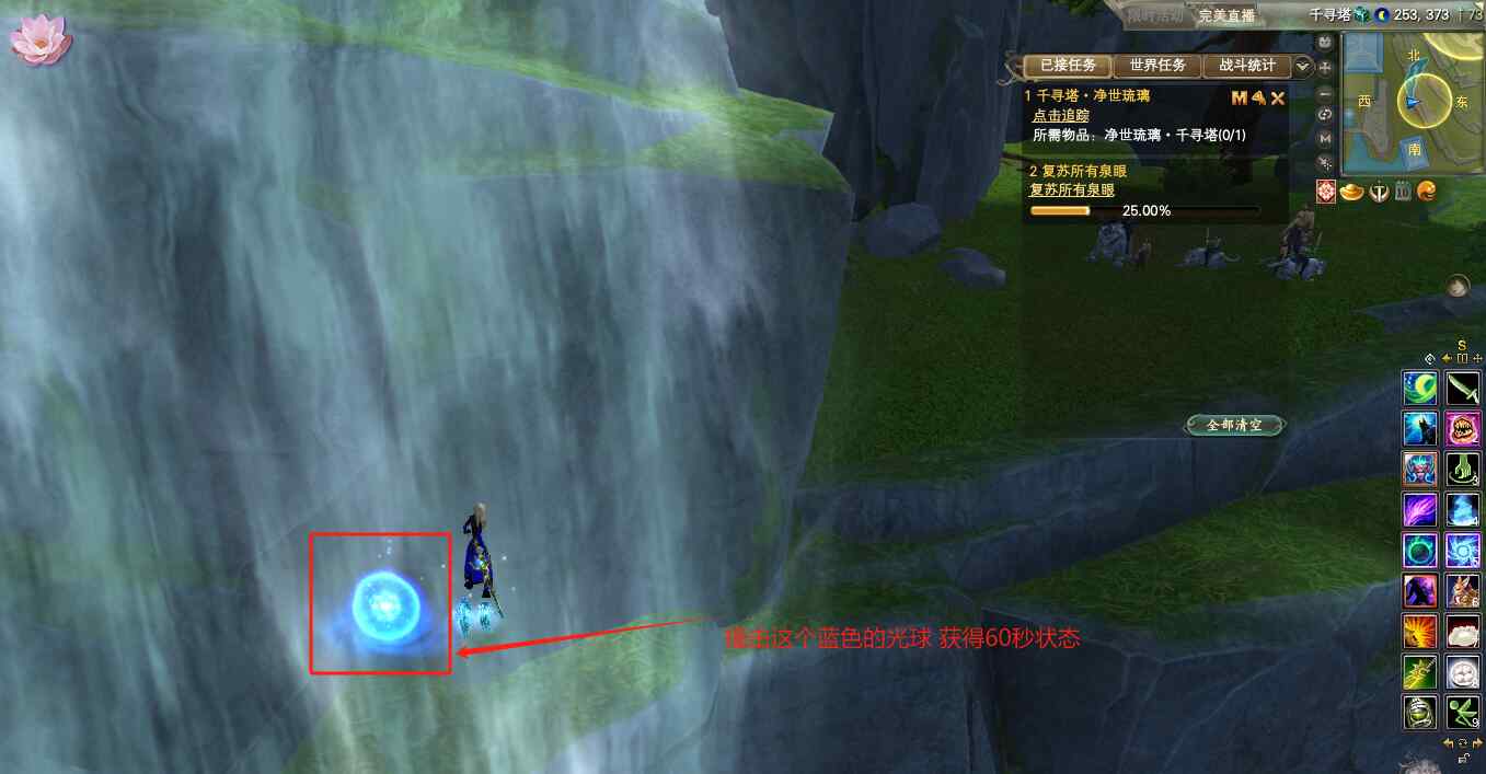 都挖完以后,回到千尋塔找賽慕(263.388)交任務(wù)。進入塔內(nèi)后,繼續(xù)對話賽慕,挖取面前的機關(guān),彈出劇情動畫,完成后回到塔外,對話新出現(xiàn)的NPC豐憬(263.389),接到任務(wù)凈世琉璃,去(255.374.高度71)找水之寶珠,在瀑布的后面哦!撞擊藍色的光球,然后身上會有一個60秒的“仁”狀態(tài),這個時候趕緊加速飛行,去塔頂挖凈世琉璃!如果覺得自己飛行時間來不及,就用地圖傳送回千尋塔。飛上塔頂挖水晶下面的石墩,鼠標多移動幾次就能找到了!