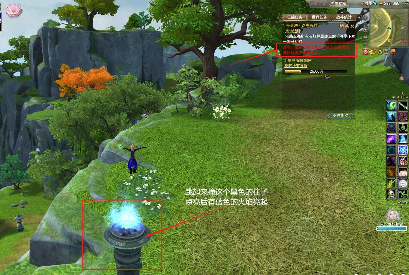 第一盞燈在山洞門口(290.289),跳起來撞這個黑色的柱子,成功點燃會出現(xiàn)藍色火焰,然后沿著山路一直往上,黑色燈柱分布在路旁邊,這里速度要快,最好是備點加速藥,也可以上坐騎。(個人覺得加速藥更好用!)