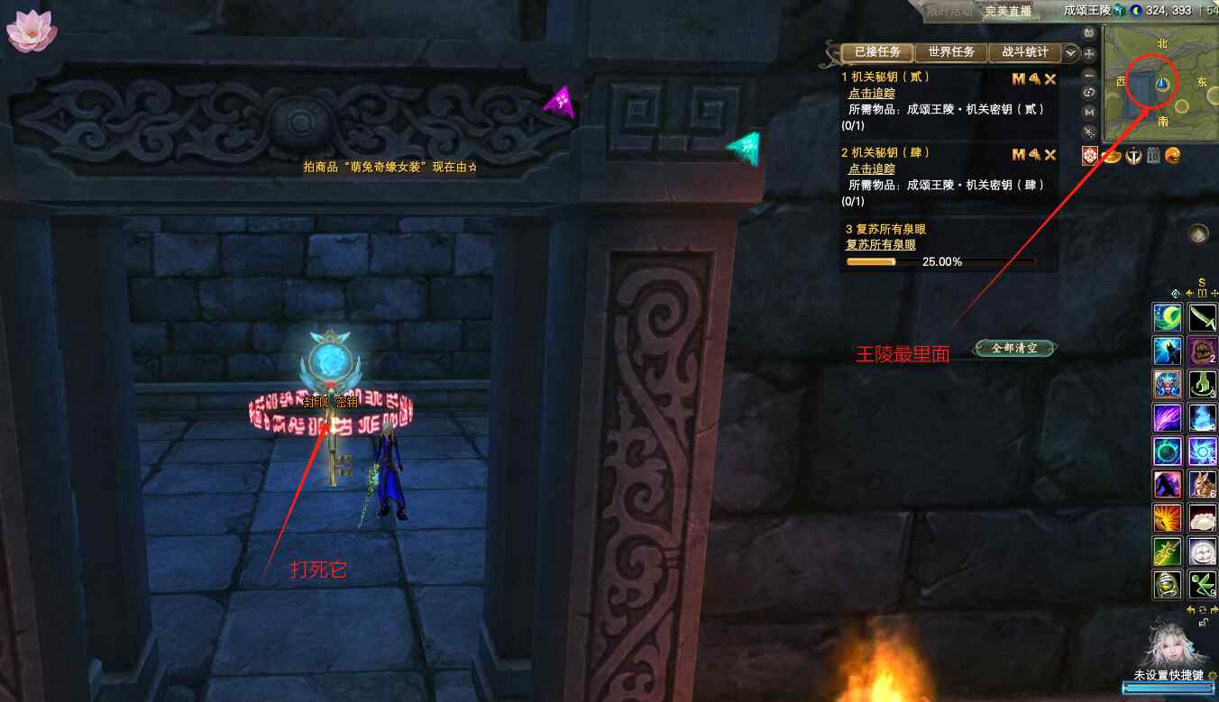 挖完以后,找賽慕(323.390)交任務(wù),分別和賽慕和豐憬對話后,前往墓穴深處找到機關(guān)。(注意:這里任務(wù)可以飛起來進入墓穴深處哦,避開地上的怪,守護者怪會秒人?。?/font>