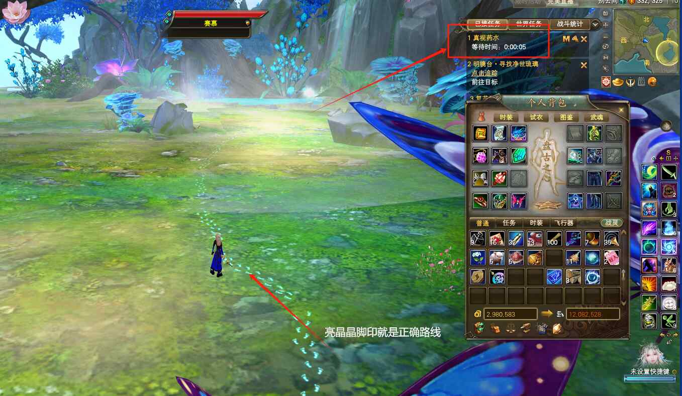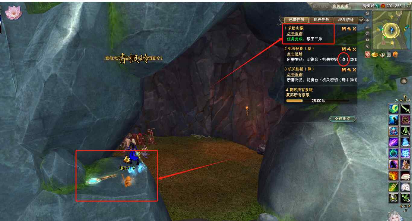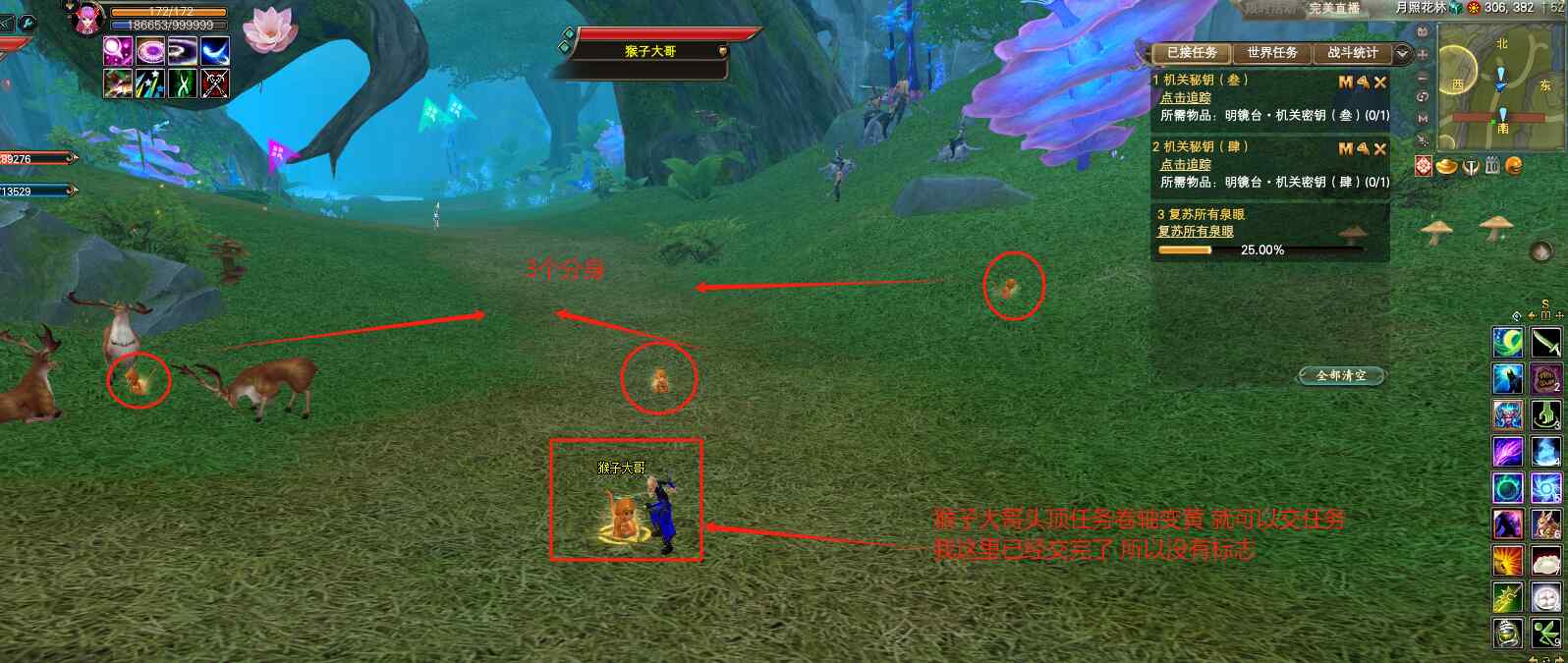 跳下瀑布,前往(301.360)對話小猴子,這時猴子開始邊跑邊出分身了,一直到出3只分身,我們跟著中間的一只到達(305.381),看到猴子大哥頭上的灰色任務(wù)卷軸標志變亮,就去找猴子大哥交任務(wù),如果任務(wù)沒成功,說明我們跟的猴子是假的,這個時候再去找旁邊的猴子,挨著猴子停留2秒,等猴子大哥頭上卷軸變亮,就去交任務(wù),直到找到真的猴子為止。注意:這里限時2分鐘,如果兩分鐘沒有完成任務(wù),那任務(wù)失敗,傳送回懸崖鑰匙處重新開始!(注意:這里很容易因為超過2分鐘時間失??!小可愛們可以使用神行或者盜驪丹加速?。?/font>