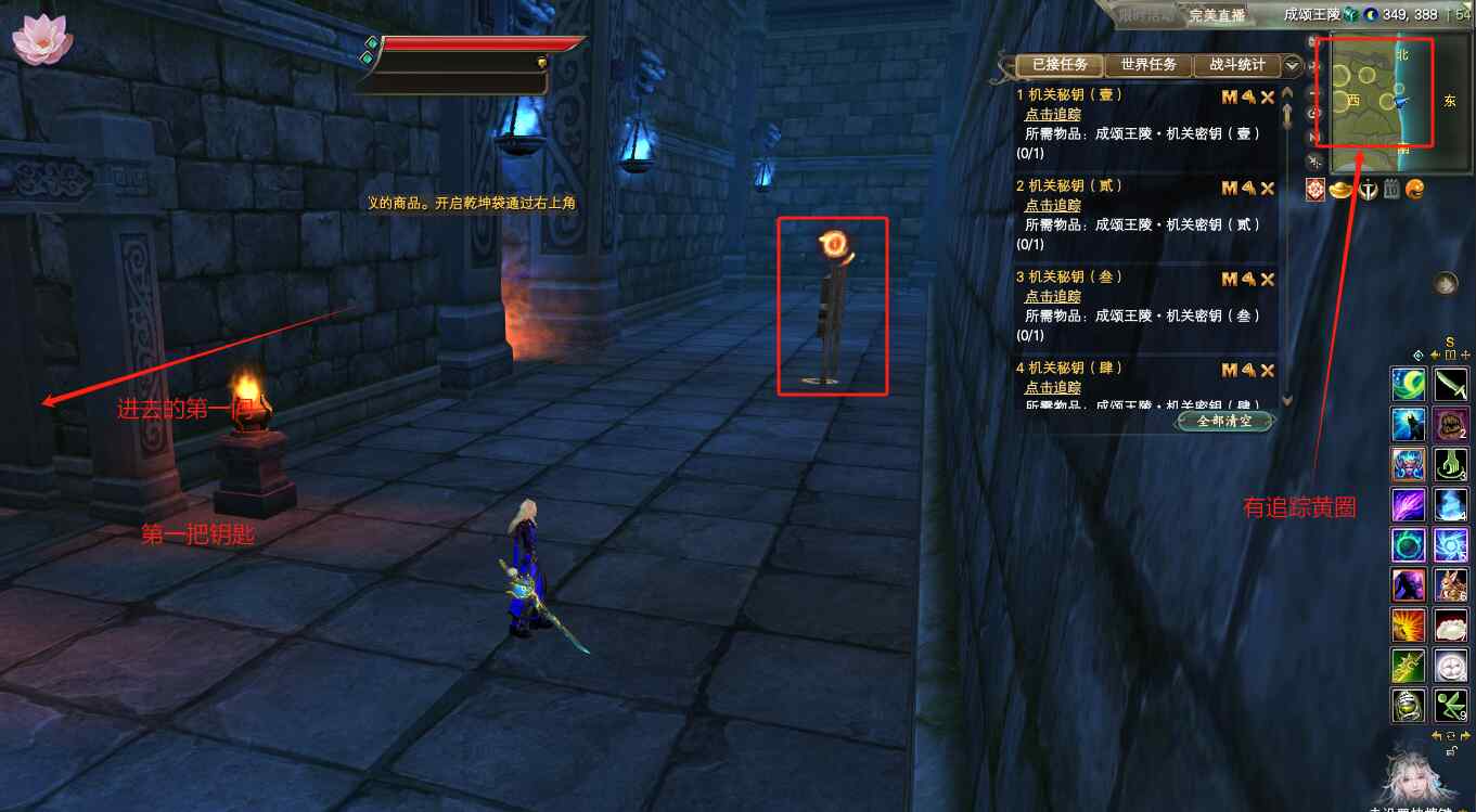 小技巧:四把鑰匙都有追蹤黃圈,王陵里面是“回字形”房間結(jié)構(gòu),愛迷路的小可愛,黃圈結(jié)合追蹤坐標更容易找到哦!