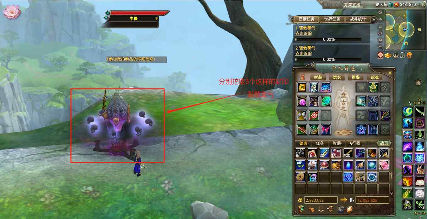 四把秘鑰挖好了以后,返回明鏡臺,到山洞里(315.330.高度84)挖取機關(guān),看完劇情動畫后,前往別云間,和賽慕(331.325)對話接任務(wù),這里包里會給一個真視藥水,右鍵使用可以看到霧氣里正確的路線,持續(xù)5秒時間,跟著路線,到達(340.321.)對話豐憬,接到驅(qū)散霧氣任務(wù)。