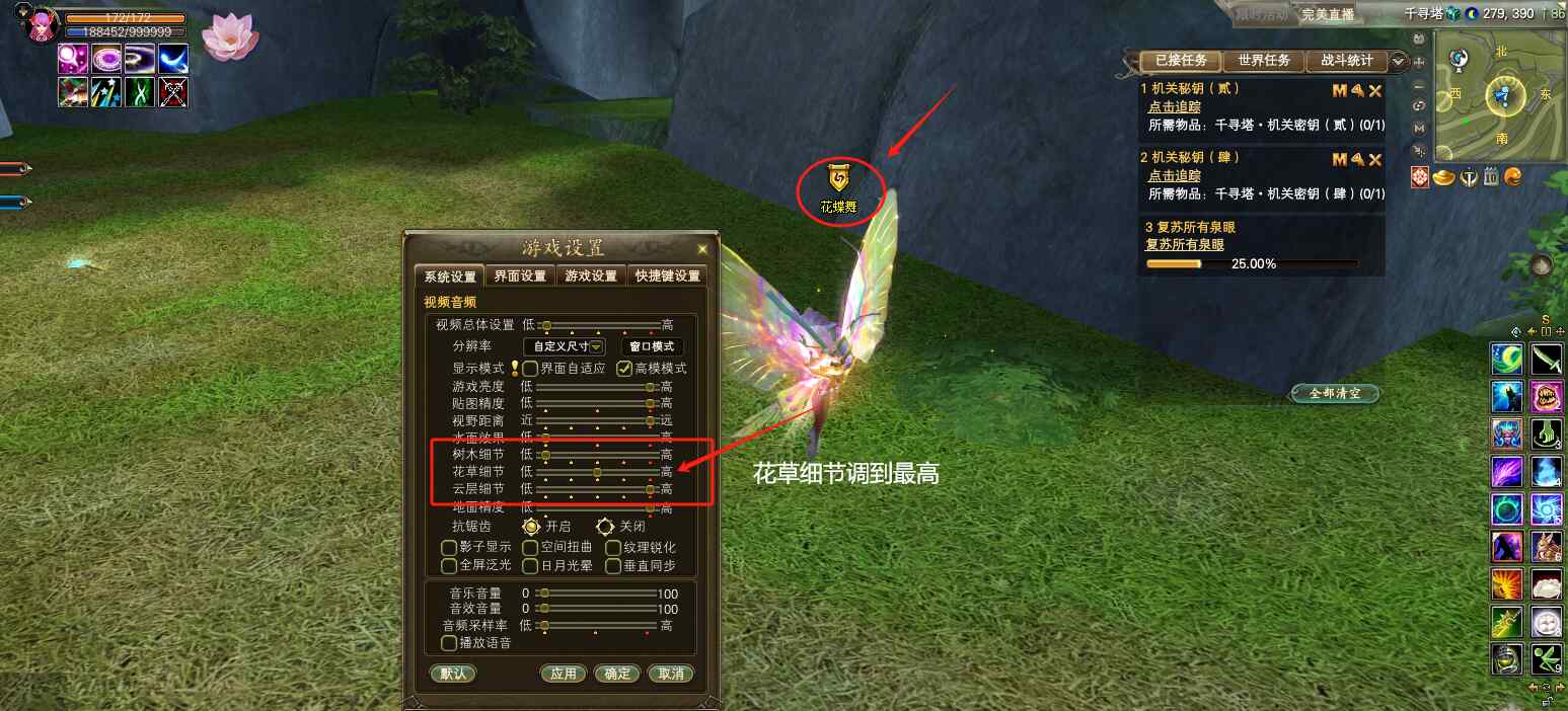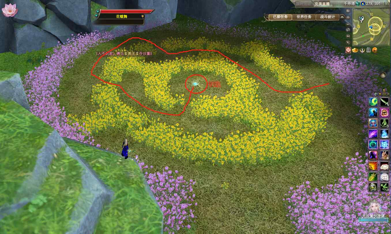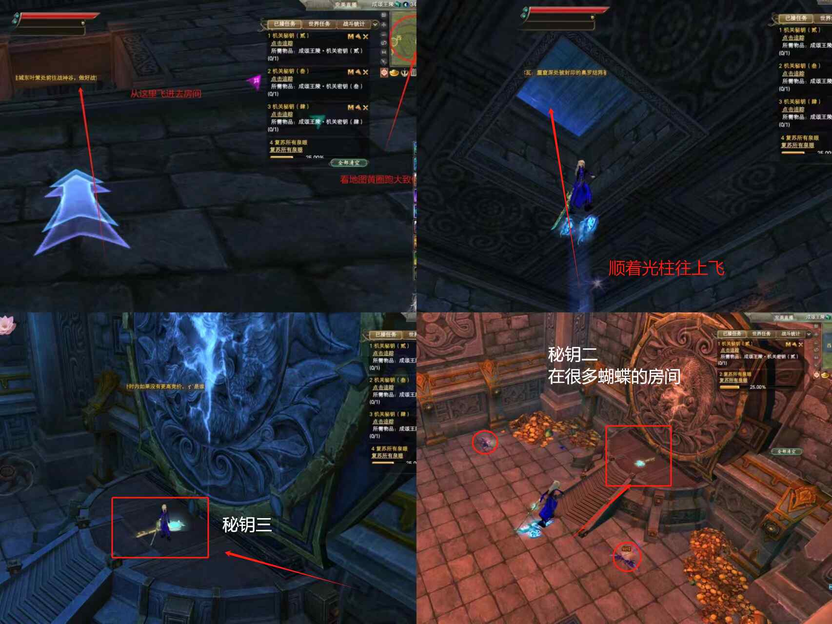 終點是塔下那個矮矮的石墩(363.389),點燃后會出現(xiàn)一個NPC-賽慕,和賽慕對話完成后,進入塔內(nèi),繼續(xù)對話賽慕,然后挖取機關(guān),就是地上的鑰匙圖案(263.391),挖完后繼續(xù)對話賽慕,接到任務(wù),去挖剩下的三把鑰匙。地圖上都是給出了追蹤黃圈的,小可愛們?nèi)ハ鄳奈恢脤ふ壹纯桑?br />第二把鑰匙,到花蝶舞(280.389.高度86)接任務(wù),對話后,需要到花叢里面取出鑰匙,不能踩到任何一朵花,否則失敗重來。注意:這里是禁止飛行狀態(tài)哦,然后需要把花草特效調(diào)到最高哦,不然看不到路!