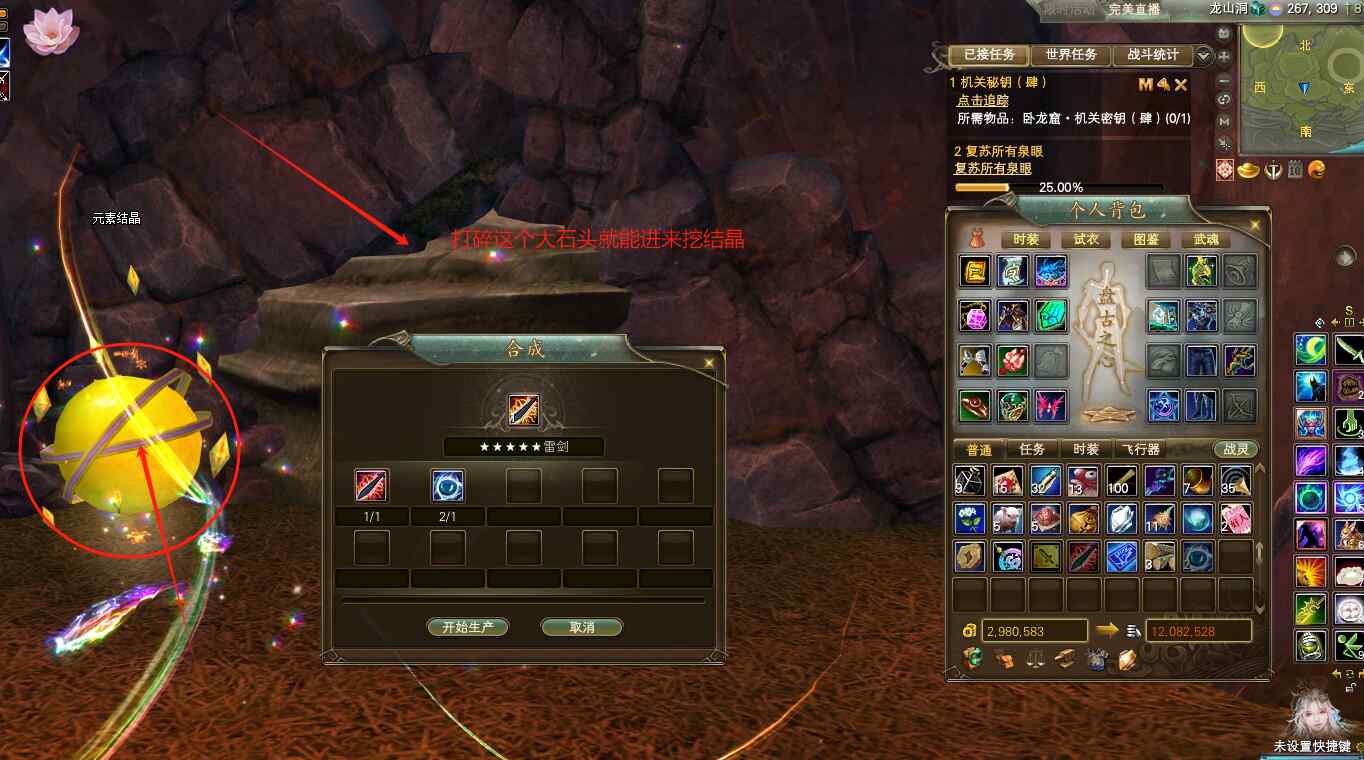 4把秘鑰都挖好以后,去開啟機關(guān),在豐憬后面的龍山洞里(266.313)挖取機關(guān),然后對著巨石使用包里的4星雷劍,打碎巨石后,進入山洞,挖取“元素結(jié)晶”。