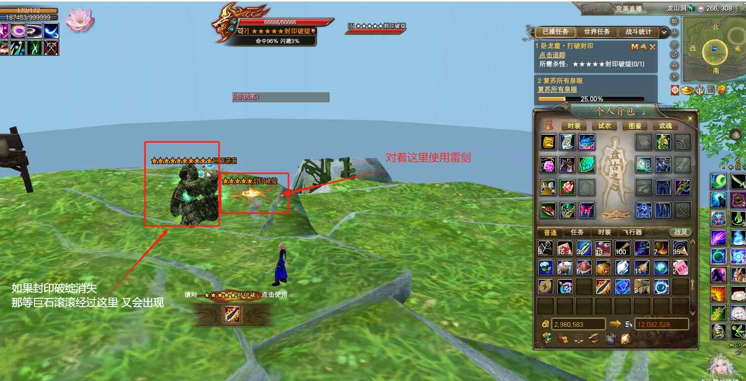 很多小可愛說這里打碎了石頭,也進不去山洞,最簡單的辦法是,點擊山洞里的黑板,使用技能如夜影無情游,劍靈御心劍,進入山洞,或者找一個MO、WX把你推進去。出去就很簡單了,挖完結(jié)晶以后,通過地圖上的“炁”傳送回臥龍窟。 使用包里的元素結(jié)晶,把雷劍升級到5星,回到山頂(266.307)找到封印破綻,使用包里的5星雷劍,打碎封印。注意:封印破綻出現(xiàn)一會兒會消失,如果到達坐標沒有,等待一會兒就會出現(xiàn)了!獲得成就:“硄!”獎勵5個天行宮饋印。