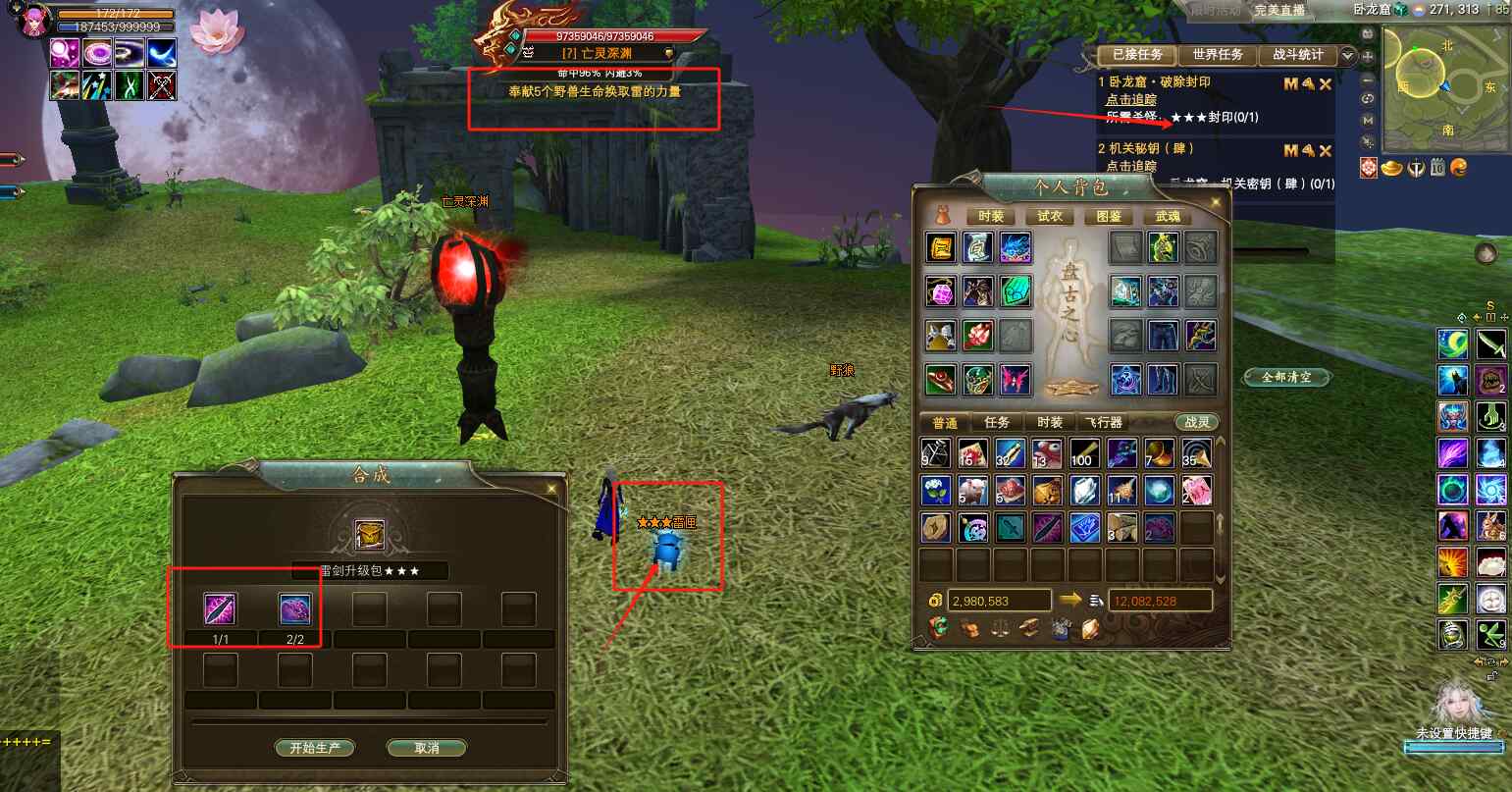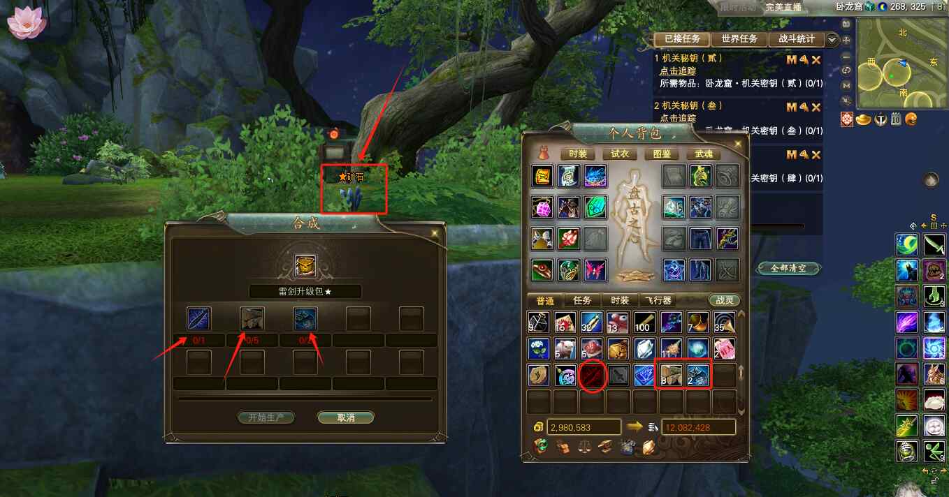 機關(guān)秘鑰二,打地上的木頭,會掉落木材,撿起來有用!然后到(267.324.高度81)打礦石,掉落礦石。都需要用包里的雷劍打哦!打夠5個木材和2個礦石,就可以打開背包,放入材料,升級我們的雷劍了!升級成2星雷劍以后,到(266.323.高度81)挖取第二把秘鑰。