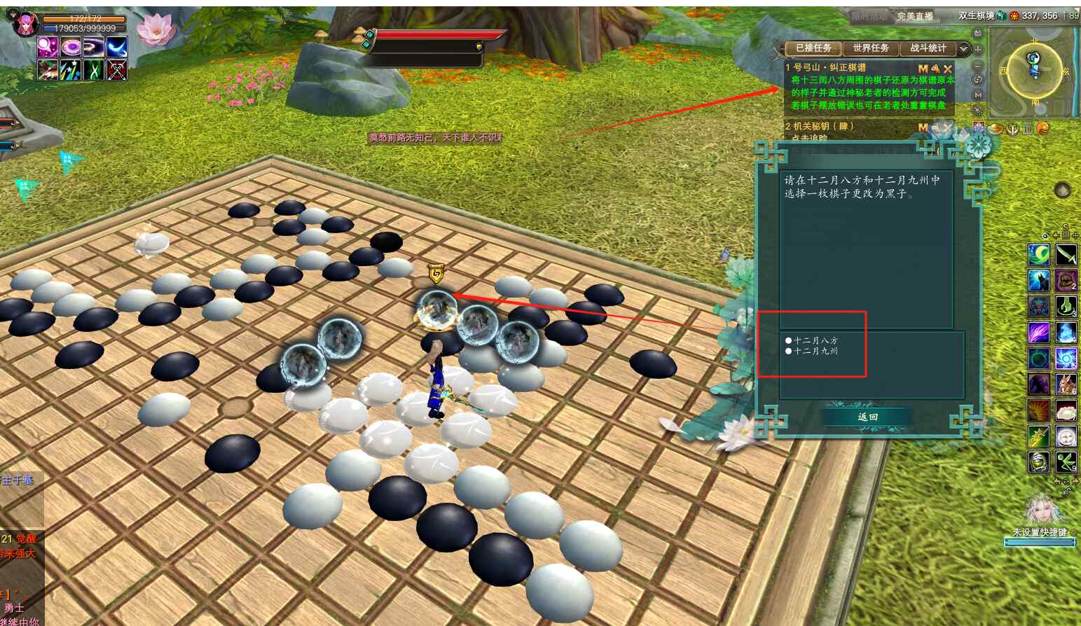 繼續(xù)對話神秘老者,接到任務(wù)糾正棋局,黑白互換!一共5個棋子需要糾正,如果中途放錯了,也可以找老者重置棋子位置!同樣是通過棋盤十九道線來確定位置的哦!按照順序,答案分別是:十二月八方,十三閏七斗,十四雉九州,十三閏八方,十二月九州。
