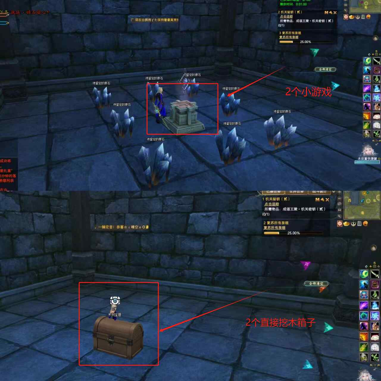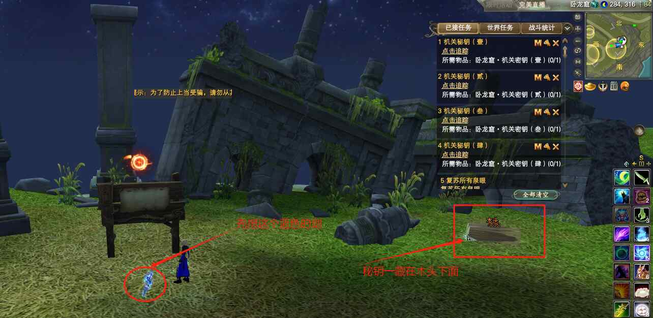 機關(guān)秘鑰一,前往(281.316.高度84)挖地上藍色的劍,然后去木頭堆(283.315)挖下面的鑰匙。