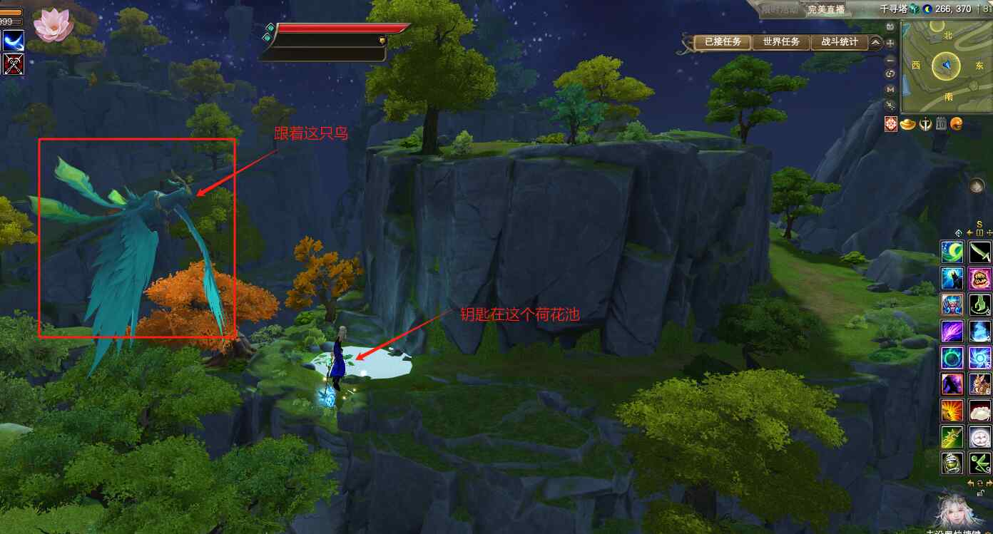 第四把鑰匙,到(265.371.高度77)對話黑板,提示“飛鳥俯瞰之路,鑰匙藏匿其中”,跟著空中飛的青色飛鳥,到對面的荷花池(283.360.高度75),找到第四把鑰匙。