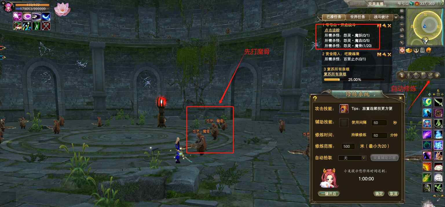 繼續(xù)對話神秘老者,前往(339.346.)挖取機關(guān),完成后回去老者交任務(wù),對話完成后,接到“開啟戰(zhàn)斗任務(wù)”,前往(338.369.高度79)打怪,3種怪一共需要26只,難度不大,小號也能輕松完成!先打20只魔骨,再打5只魔垚,打完魔垚,魔妖才會在中間出現(xiàn)?。ㄏ胪迪聭械男】蓯?,這里可以開啟自動修煉打怪哦!)