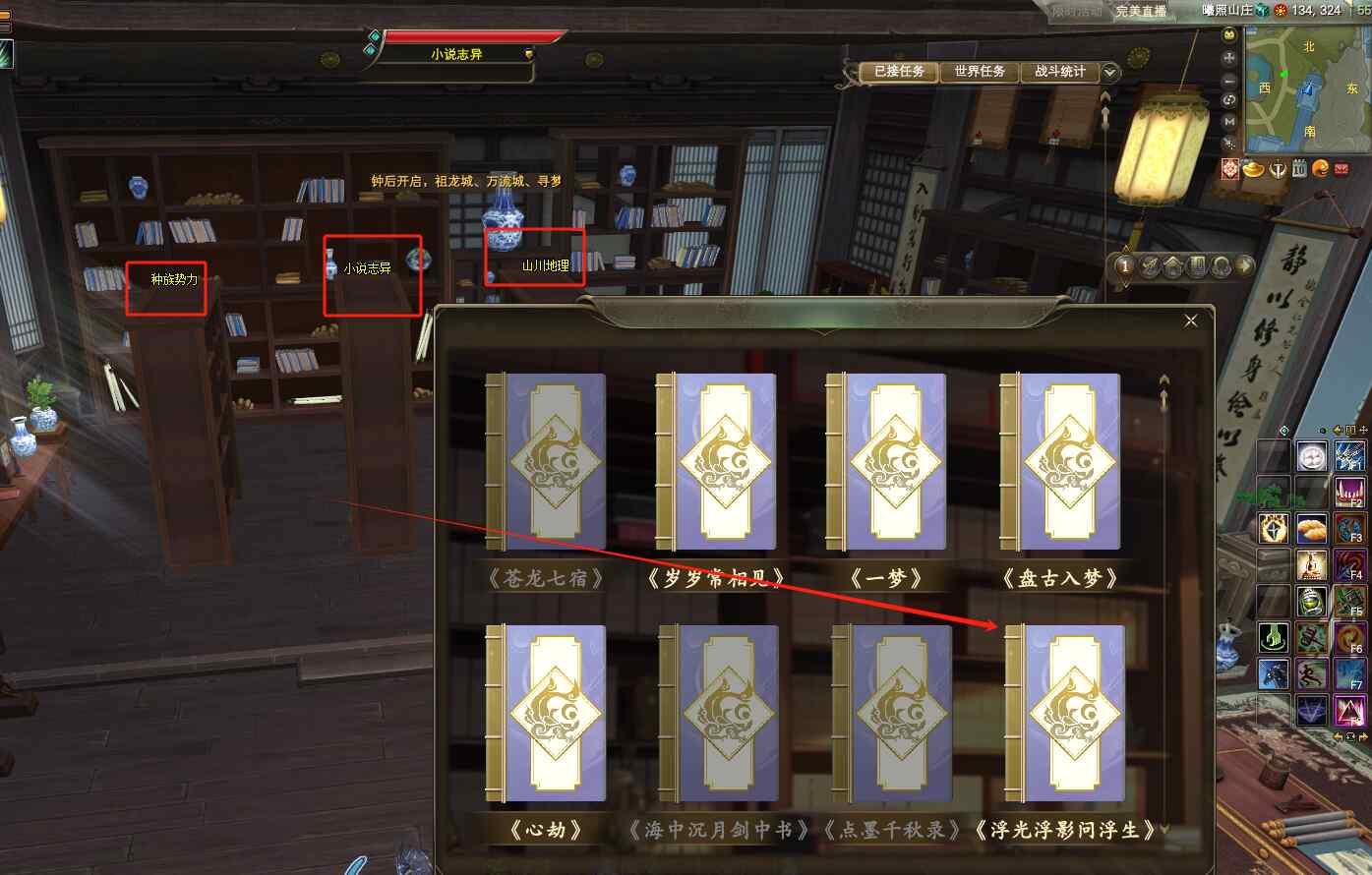 到達(dá)東路以后,傳送到曦照山莊,前往(134.324),在湖邊的一棟房子里,里面有6個書架,分別是:山川地理、小說志異、種族勢力、刑事卷宗、政治外交、人文風(fēng)俗。