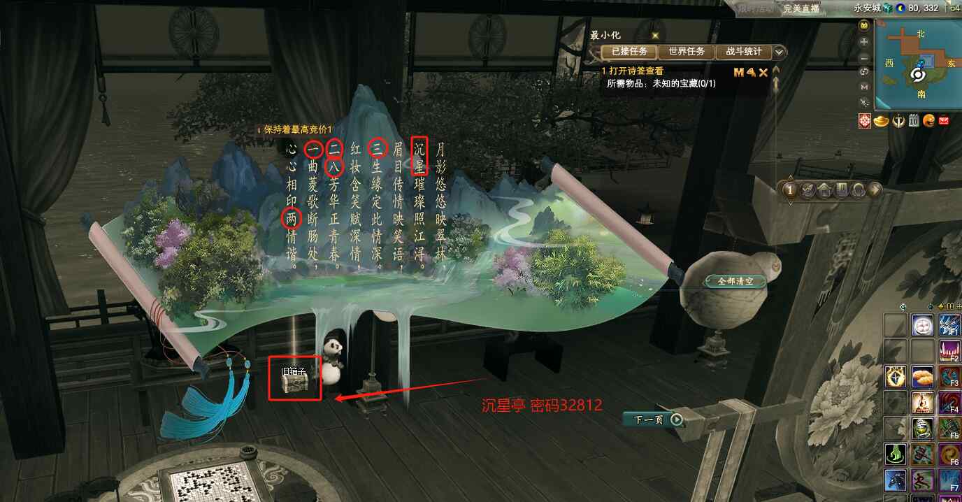 挖取完成后,獲得一個“香囊”,返回曦照山莊找岳陽(135.321)交任務(wù),對話后得到第三個詩簽,推斷出第三個箱子在沉星亭哦(80.332),密碼是32812.