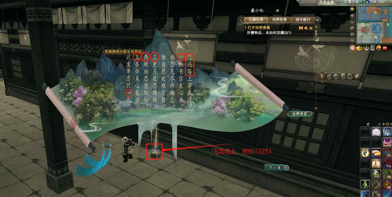 到NPC岳陽處(135.321)接到任務(wù)未知的寶藏,打開包里的詩簽,根據(jù)詩簽我們推斷出,第一個藏寶箱子在重蕊畫舫(205.367.高度54)密碼139哦!