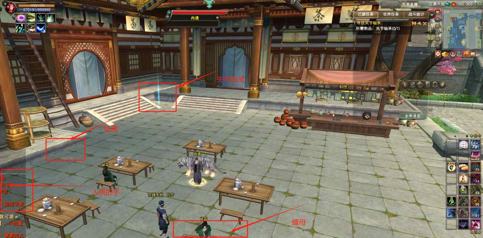 觸發(fā)任務后,到溶月(168.365)處對話,等待10秒,出現(xiàn)NPC冉遺(168.365),和冉遺對話后出現(xiàn)劇情,摔壞了人偶溶月,再次和冉遺對話,接到任務損壞的人偶,分別需要找到:關(guān)節(jié)軸承(166.367),墊圈(167.365),螺母(168.364),人偶的手(167.364),都在冉遺的周圍,按順序挖,挖完一個才會出現(xiàn)下一個。(注意:看不到藍色光柱提示的小可愛,打開光效設置哦?。?/p>