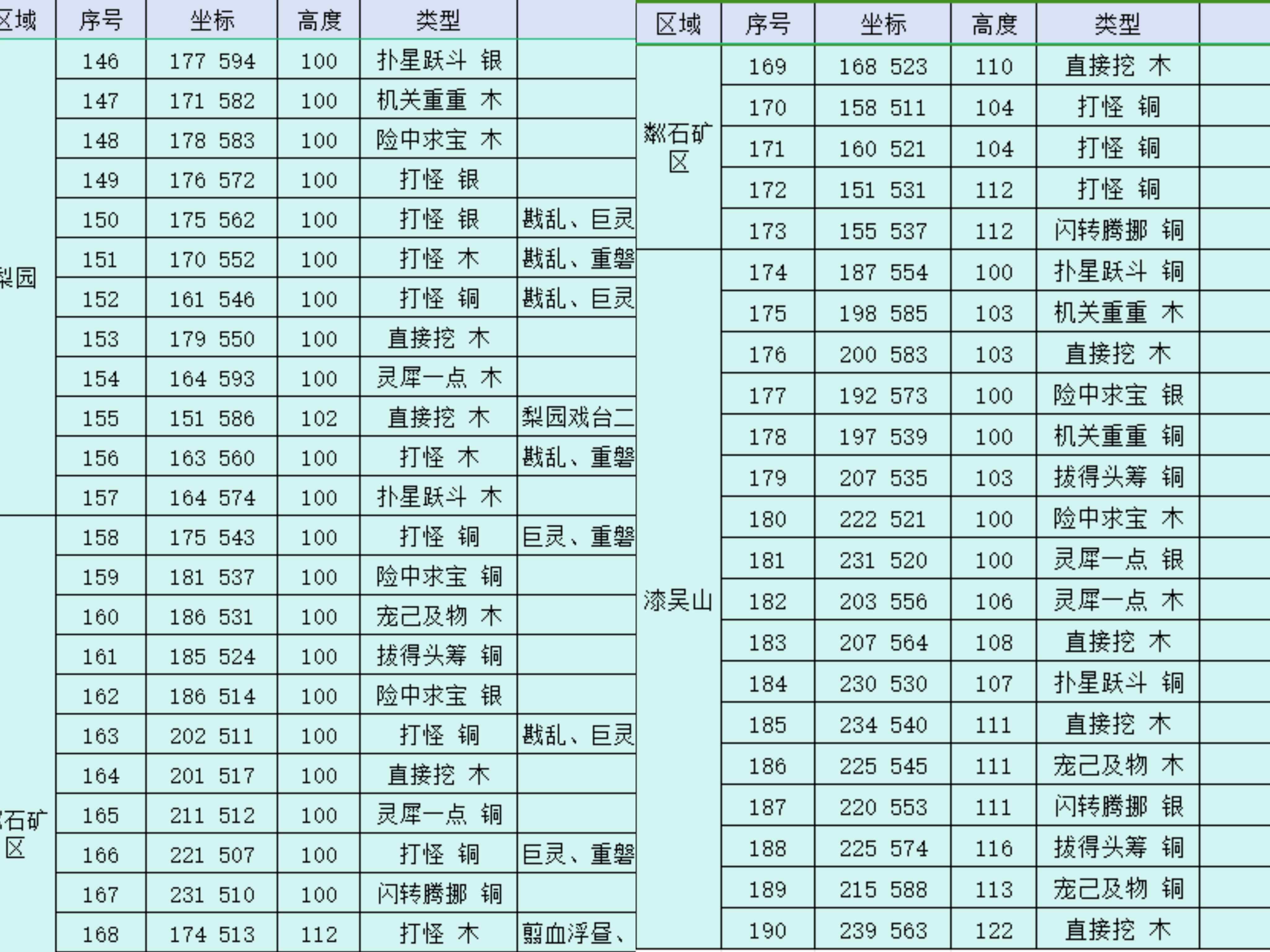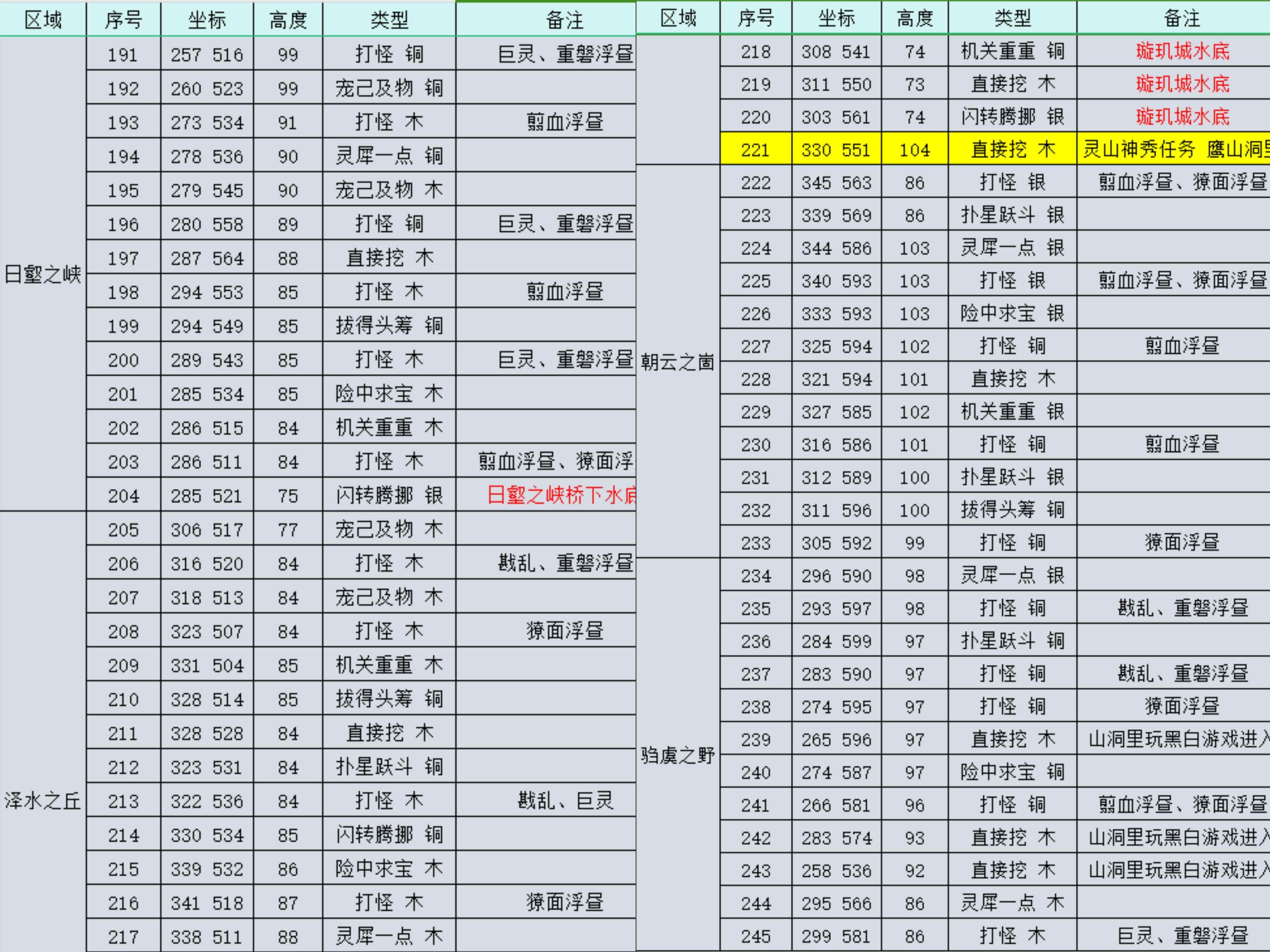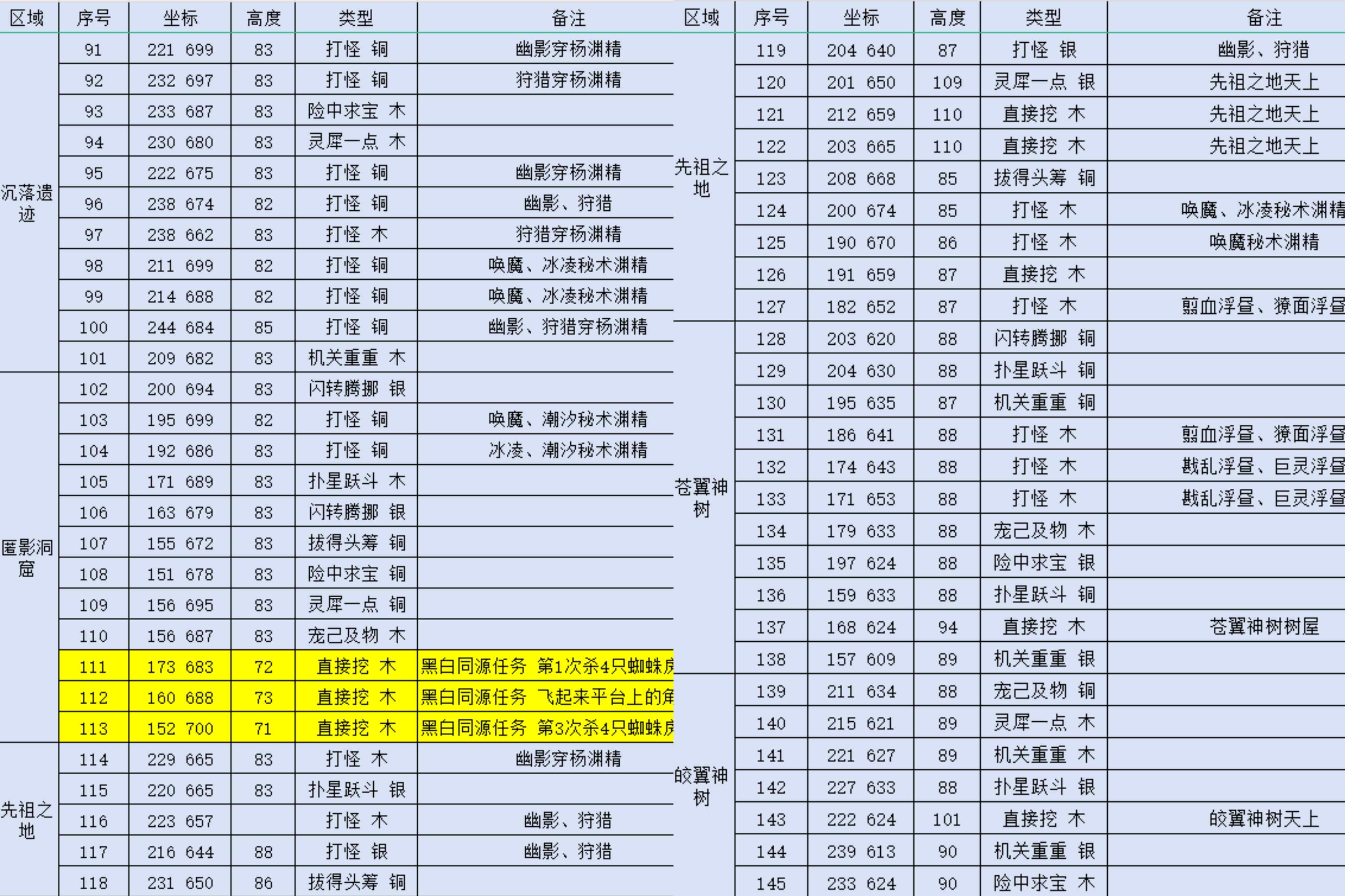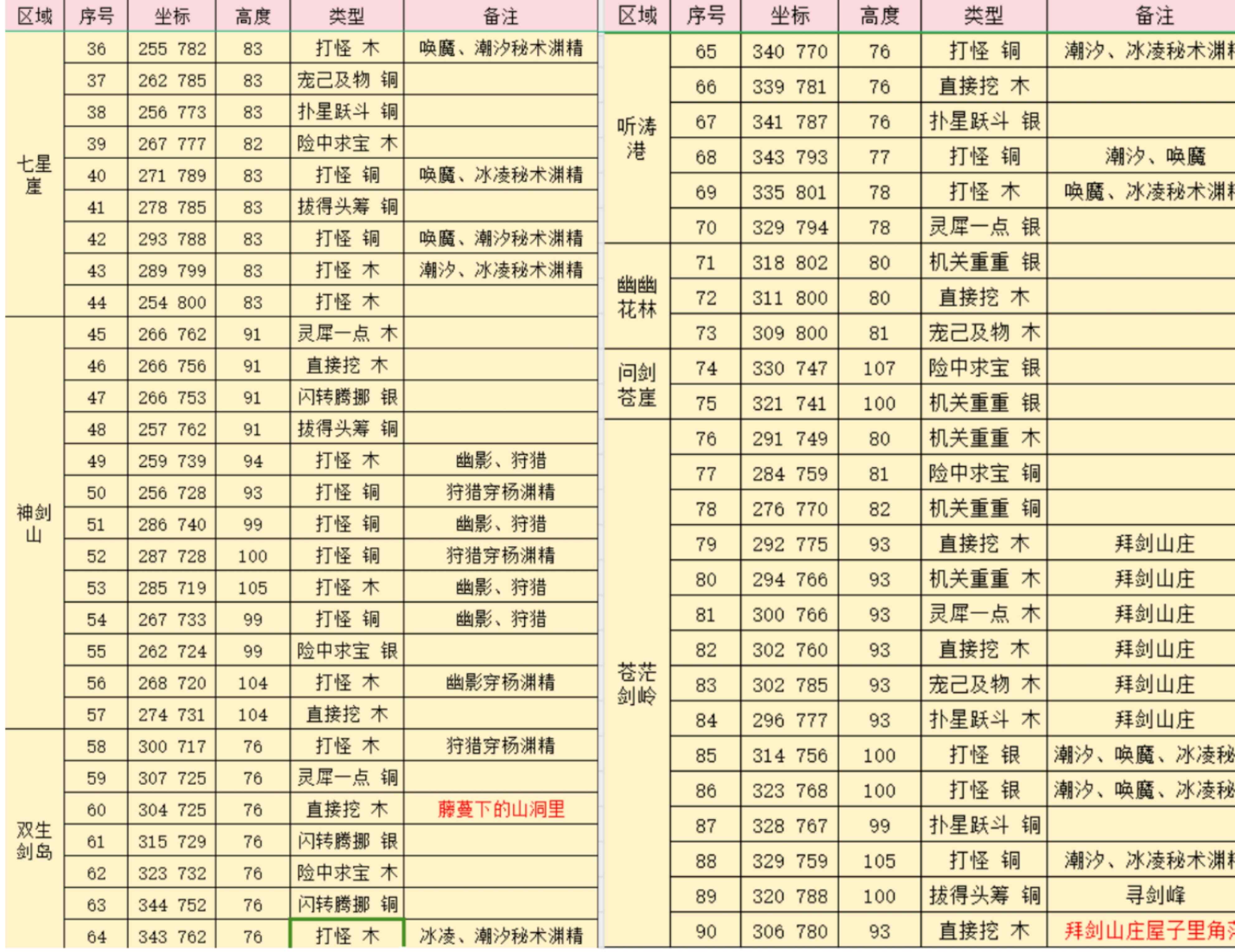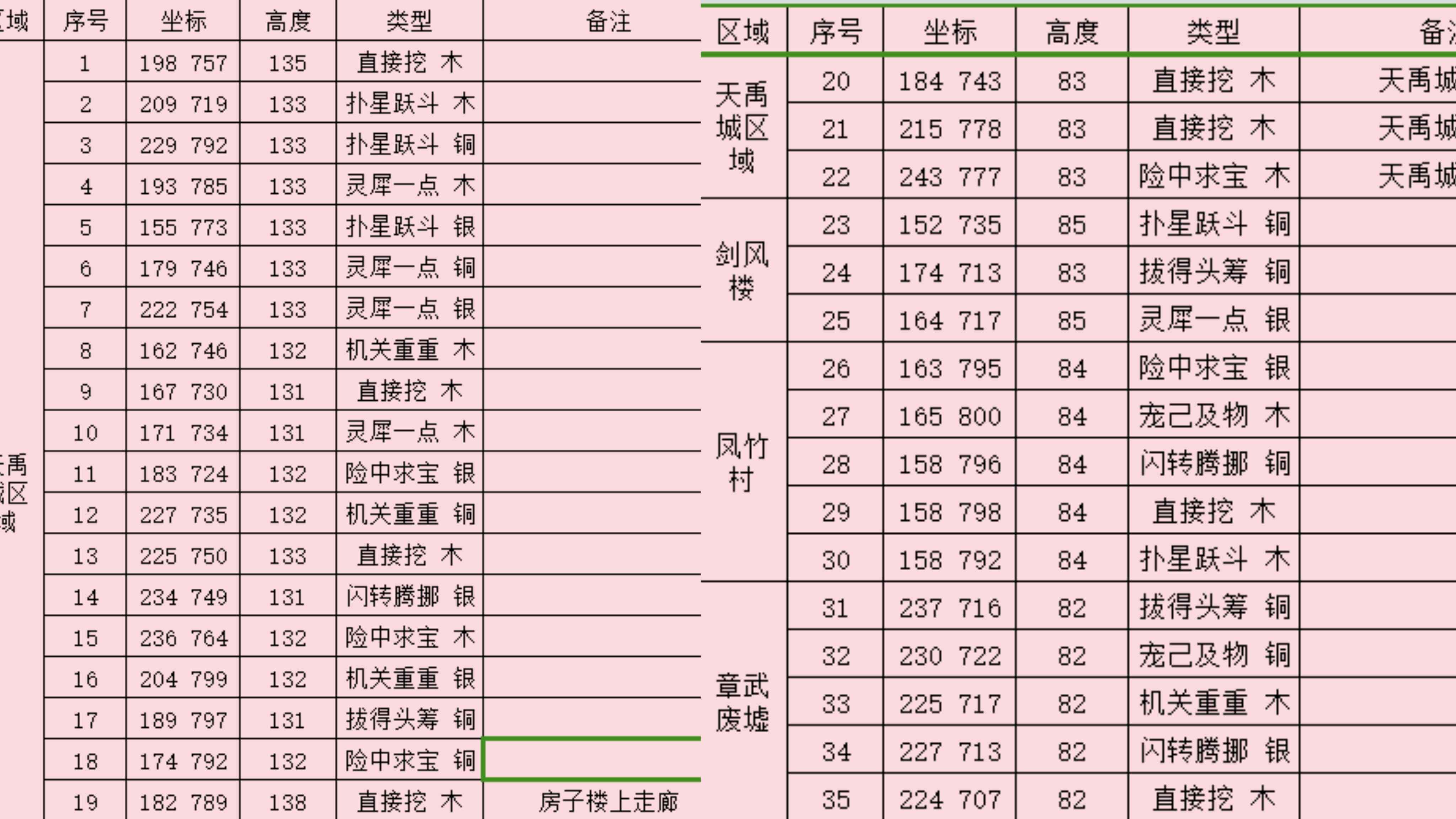 詳細(xì)坐標(biāo)和高度如下。對(duì)照著坐標(biāo)都能很快找到,如果到達(dá)坐標(biāo)點(diǎn)沒(méi)有找到,再查看高度調(diào)整位置?。t字標(biāo)注的位置容易漏掉,需要特別注意一下哦?。?/h4>