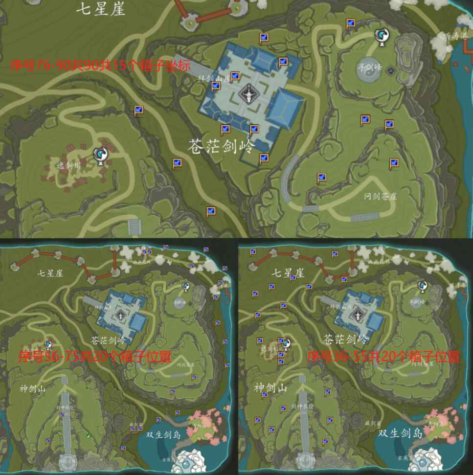 拜劍山區(qū)域包括:神劍山,七星崖,蒼茫劍嶺,尋劍峰,雙生劍島。一共55個(gè)箱子地圖具體位置如下。(坐標(biāo)較多,可以分3次設(shè)置坐標(biāo)點(diǎn)哦,而且這個(gè)區(qū)域打怪箱子較多,小號(hào)攻擊不夠會(huì)打的比較困難,可以組隊(duì)或者找大號(hào)帶。)