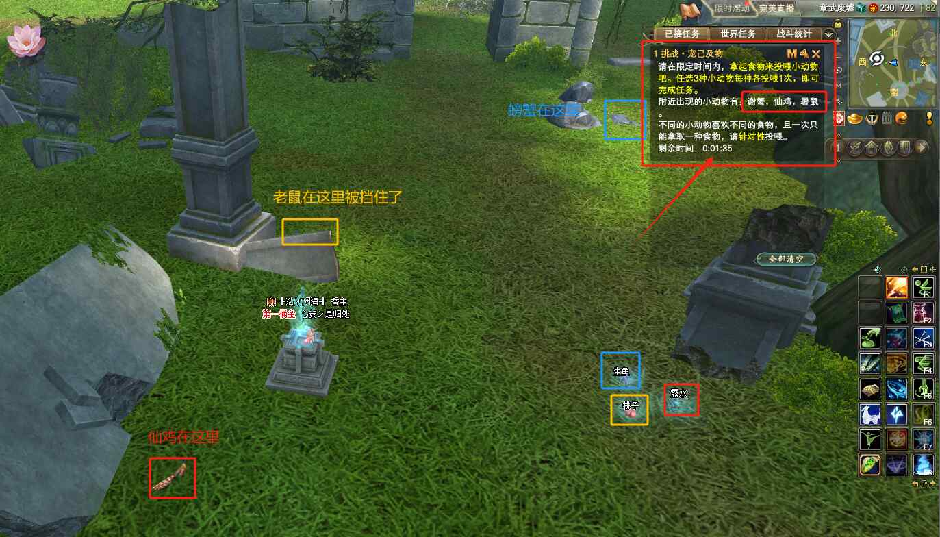 游戲三:挑戰(zhàn)·寵己及物。  需要在規(guī)定的時(shí)間內(nèi)(2分鐘或者3分鐘),挖取食物投喂小動(dòng)物,食物周?chē)鷷?huì)出現(xiàn)3-4種小動(dòng)物,每種小動(dòng)物喜歡不同的食物。螃蟹--喂生魚(yú)、老鼠--喂桃子、仙雞--喂露水、蝴蝶--喂蜂蜜、鹿子--喂靈菇。一次只能挖一種食物投喂,任選3個(gè)小動(dòng)物,每種投喂一次即可完成挑戰(zhàn)哦!根據(jù)限定時(shí)間長(zhǎng)短和出現(xiàn)動(dòng)物數(shù)量多少,獎(jiǎng)勵(lì)木箱子和銅箱子。