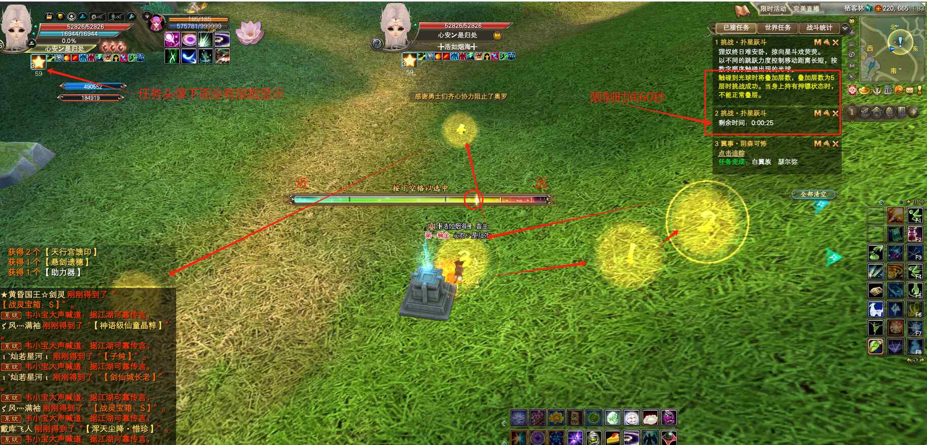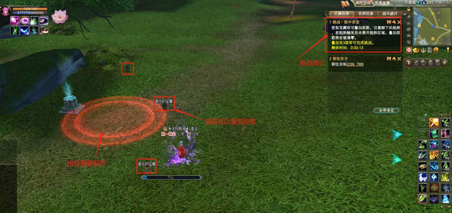 游戲六:挑戰(zhàn)·險(xiǎn)中求寶。  寶藏隨機(jī)出現(xiàn)在石柱周?chē)?,成功挖取寶藏可以疊加層數(shù),一個(gè)寶藏可以重復(fù)挖取兩次,挖取過(guò)程中,腳下會(huì)出現(xiàn)紅色陷阱區(qū)域,記得及時(shí)躲開(kāi),紅色光圈擴(kuò)散到最大時(shí)還沒(méi)有躲開(kāi),身上疊加的層數(shù)會(huì)被清零,需要重新來(lái)哦!在限定時(shí)間60秒之內(nèi),挖取寶藏疊加至3層完成挑戰(zhàn),獎(jiǎng)勵(lì)木箱子。4層完成挑戰(zhàn),獎(jiǎng)勵(lì)銅箱子。5層完成挑戰(zhàn),獎(jiǎng)勵(lì)銀箱子。超出時(shí)間則挑戰(zhàn)失敗。