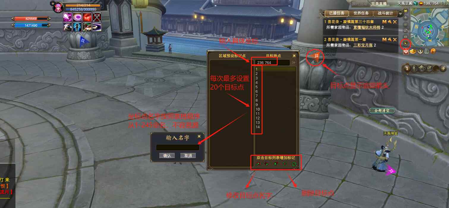 今天給大家?guī)?lái)的是天禹城各區(qū)域245個(gè)寶匣的詳細(xì)攻略哦,包括具體坐標(biāo),游戲挑戰(zhàn)玩法,箱子獎(jiǎng)勵(lì)明細(xì)等等哦!我們還是把天禹城劃分為5個(gè)大的區(qū)域哦,分別是:天禹城、拜劍山、棲客林、漆吳山域、靈山。一共245個(gè)寶匣,每個(gè)區(qū)域分布個(gè)數(shù)不等,大致在35-55個(gè)之間,所以我們?cè)谠O(shè)置坐標(biāo)追蹤點(diǎn)的時(shí)候就需要注意分次標(biāo)記!在游戲界面右上角的地圖追蹤點(diǎn)設(shè)置里面,一次最多可以同時(shí)設(shè)置顯示的坐標(biāo)數(shù)量是20個(gè)!如下圖所示,設(shè)置的時(shí)候,我們可以按照寶匣的排列順序來(lái)對(duì)應(yīng)坐標(biāo)點(diǎn)順序,這樣清晰明了,不容漏掉或者重復(fù)設(shè)置。同時(shí)還有顯示目標(biāo)點(diǎn)的追蹤指向箭頭, 方便我們標(biāo)記和尋找寶匣。目標(biāo)點(diǎn)改名和一鍵刪除功能 也非常實(shí)用哦!還可以找一個(gè)目標(biāo)點(diǎn),在地圖上用鼠標(biāo)左鍵點(diǎn)擊刪除一個(gè)目標(biāo)點(diǎn),不重復(fù)尋找。
