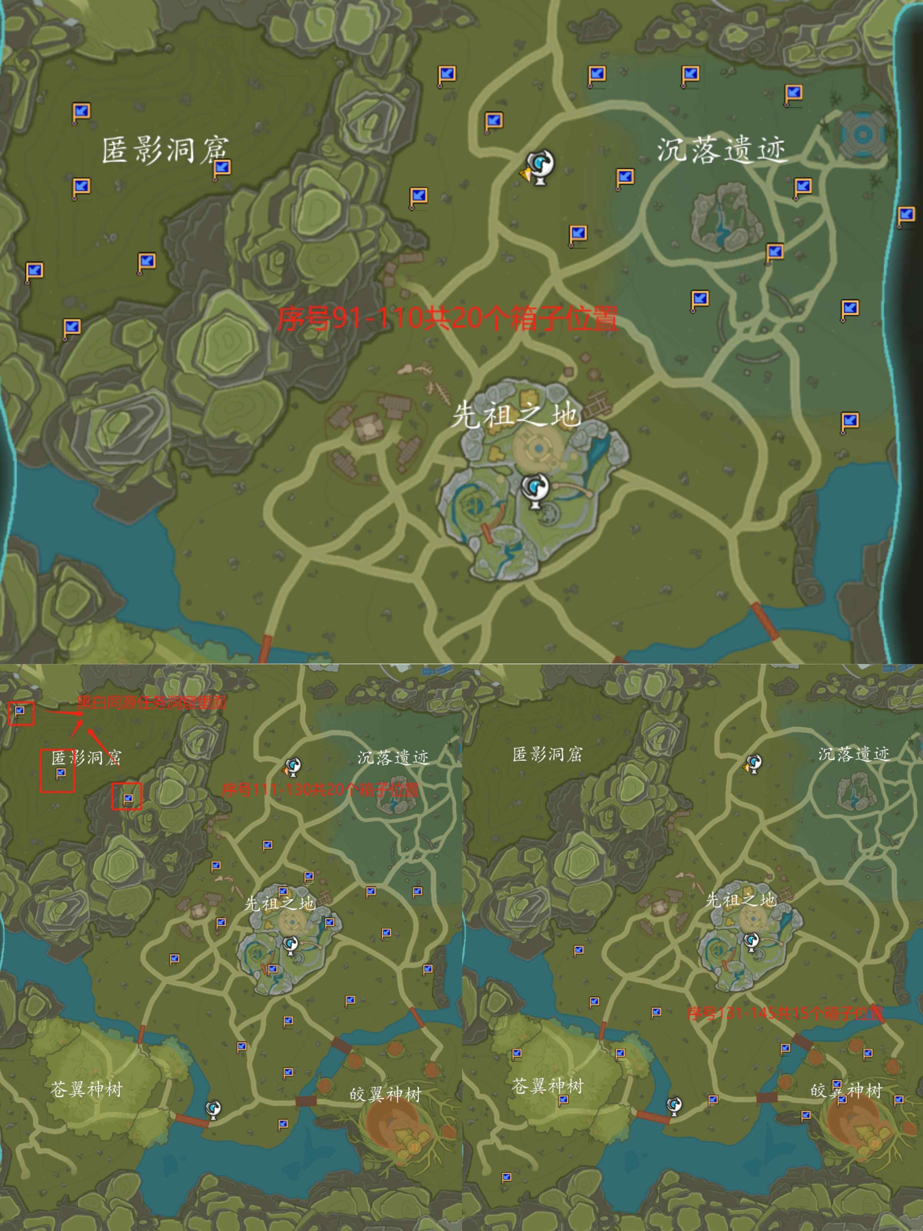 棲客林區(qū)域包括:匿隱洞窟,沉落遺跡,先祖之地,蒼翼神樹(shù),皎翼神樹(shù)。一共55個(gè)箱子地圖具體位置如下。(坐標(biāo)比較多,需要分3次設(shè)置坐標(biāo)點(diǎn),需要打怪的箱子也多,小號(hào)攻擊不夠會(huì)打的比較困難,可以組隊(duì)或者找大號(hào)帶。需要注意的是,匿影洞窟有3個(gè)箱子坐標(biāo),不是在地面哦,是在黑白同源世界任務(wù)的洞窟里面。)