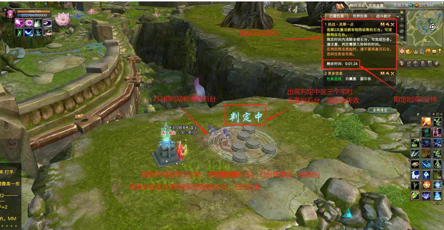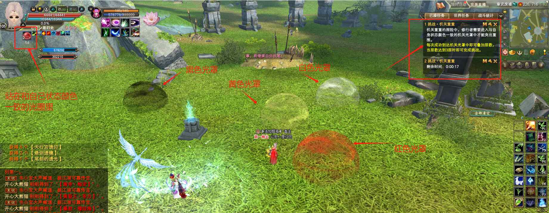 游戲七:挑戰(zhàn)·機(jī)關(guān)重重。  挖取柱子后,人物頭像下會(huì)出現(xiàn)一個(gè)指定顏色的圈圈BUFF,周?chē)鷷?huì)出現(xiàn)幾個(gè)不同顏色的光罩,我們需要站入和自身狀態(tài)顏色相同的光罩中,并停留幾秒時(shí)間,等待身上的圈圈BUFF成功疊加層數(shù)。在限定時(shí)間60秒內(nèi),狀態(tài)疊加到3層完成挑戰(zhàn),獎(jiǎng)勵(lì)木箱子。4層完成挑戰(zhàn),獎(jiǎng)勵(lì)銅箱子。5層完成挑戰(zhàn),獎(jiǎng)勵(lì)銀箱子。超出時(shí)間則挑戰(zhàn)失敗。(有些地方這個(gè)挑戰(zhàn) 因?yàn)楣饩€(xiàn)的原因,頭像下的白色圈圈看起來(lái)會(huì)發(fā)黑發(fā)灰,很像黑色圈圈,小伙伴們仔細(xì)分別就沒(méi)問(wèn)題的!)