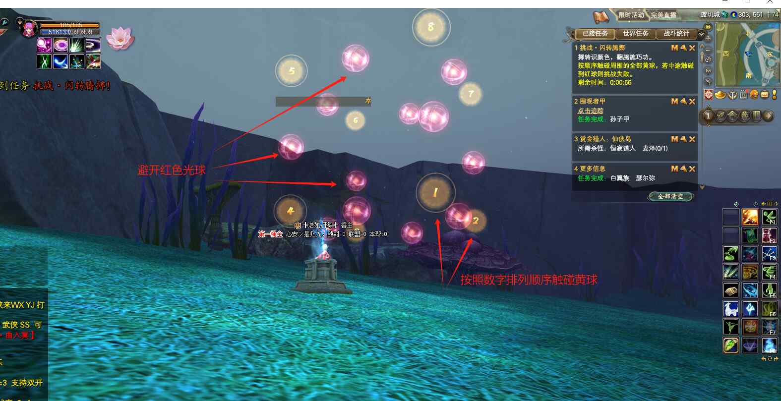 游戲一:挑戰(zhàn)·閃轉(zhuǎn)騰挪。  游戲開(kāi)始會(huì)出現(xiàn)紅色和黃色的光球,避開(kāi)紅色光球,按照數(shù)字順序依次觸碰黃球,即可完成挑戰(zhàn)哦,出現(xiàn)黃色光球1-5,獎(jiǎng)勵(lì)銅箱子。出現(xiàn)黃色光球1-8,獎(jiǎng)勵(lì)銀箱子!游戲限時(shí)60秒,若不小心觸碰到紅球或者超過(guò)時(shí)間導(dǎo)致挑戰(zhàn)失敗,則再次挖取柱子,重新開(kāi)始挑戰(zhàn)即可。這個(gè)挑戰(zhàn)除了在水下不太好控制方向和游動(dòng)高度,其他的都很簡(jiǎn)單哦!