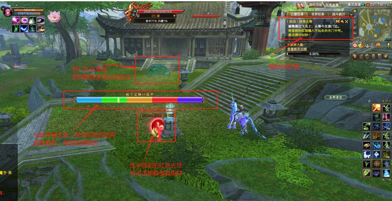 游戲二:挑戰(zhàn)·拔得頭籌。  挖取柱子后,面前出現(xiàn)紅色光球,周?chē)贿h(yuǎn)處,會(huì)出現(xiàn)藍(lán)色光罩的球門(mén),如果視野內(nèi)看不到球門(mén),別著急,挪動(dòng)鼠標(biāo)調(diào)整視野角度,或者看看是不是被山體、植物、巖石給遮擋住了球門(mén)。選中面前的紅球,點(diǎn)擊“蹴鞠”道具開(kāi)始踢球,鼠標(biāo)光標(biāo)停留在藍(lán)色區(qū)域,球前進(jìn)距離最短,反之,鼠標(biāo)光標(biāo)停留在紫色區(qū)域,球前進(jìn)距離最遠(yuǎn)。在規(guī)定時(shí)間60秒之內(nèi),把紅球踢進(jìn)球門(mén),成功完成挑戰(zhàn),獲得銅箱子。